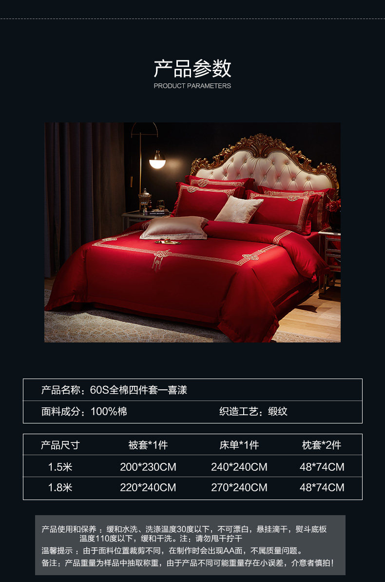 | Ширина кровати: | Четырехэтажный набор применимо к 1,5 -метровым кроватям и рекомендуется с 200*230 одеялом, Набор из четырех частей применим к 1,8-2M-кроватям, с 220*240 ядрами |