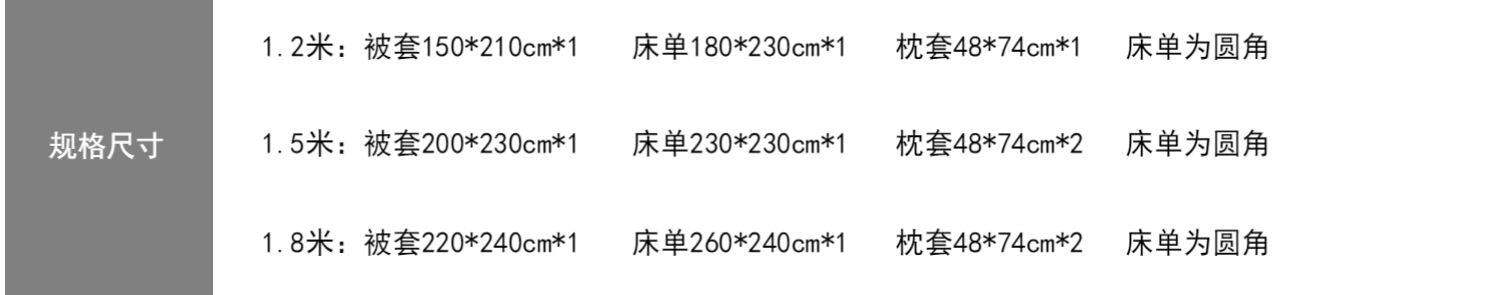 | Ширина кровати: | Три -набор для кровати применимо к 1,2 млн. С 150*210 стеганым одеялом, Четырехэтажный набор применимо к 1,5 -метровым кроватям и рекомендуется с 200*230 одеялом, Набор из четырех частей применим к 1,8-2M-кроватям, с 220*240 ядрами |