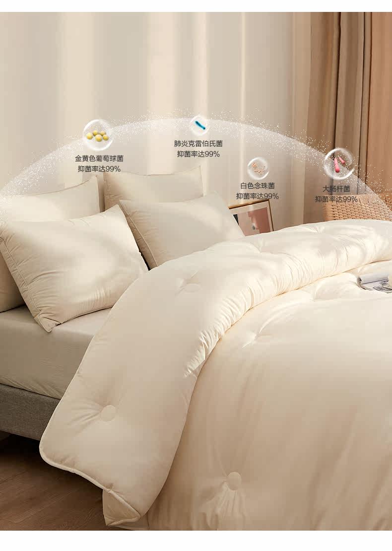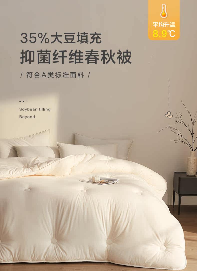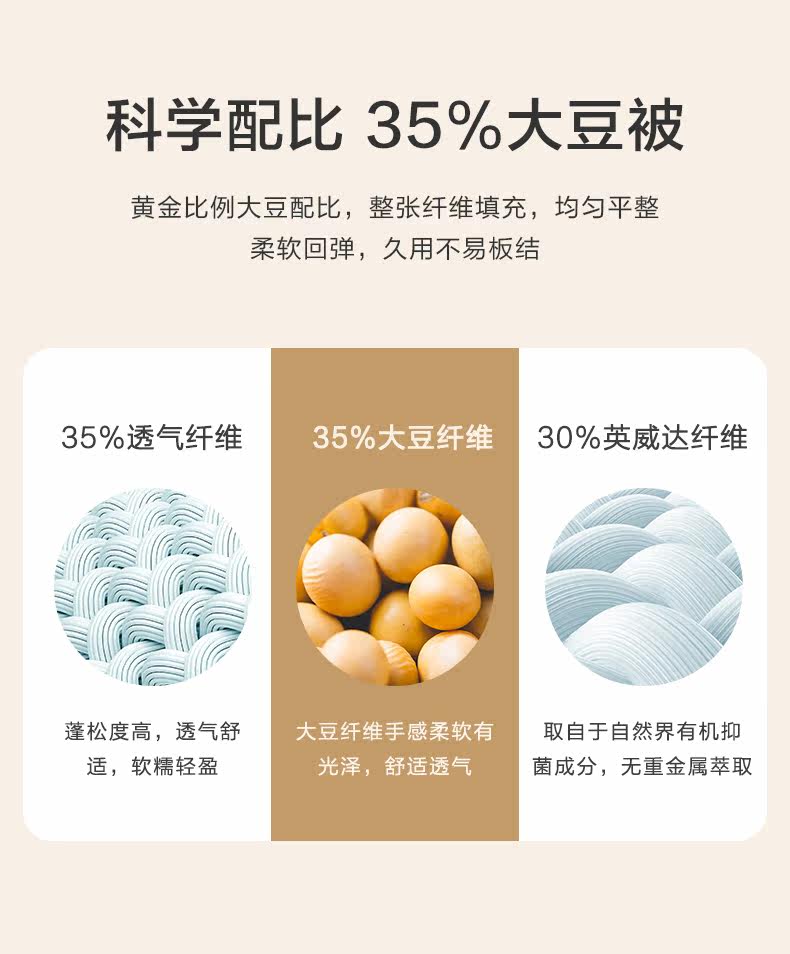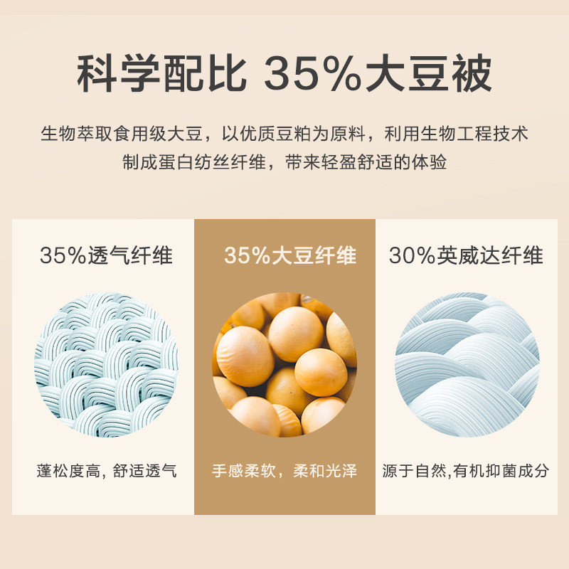 Содержание компонентов продукта | 35% соевые бобы весенне-осеннее одеяло/одеяло для кондиционирования воздуха—Белый (ткань класса А + антибактериальный материал Invista) Состав ткани: 100%полиэфирное волокно Наполнитель: 65% полиэфирное волокно + 35% композитное волокно соевого белка.