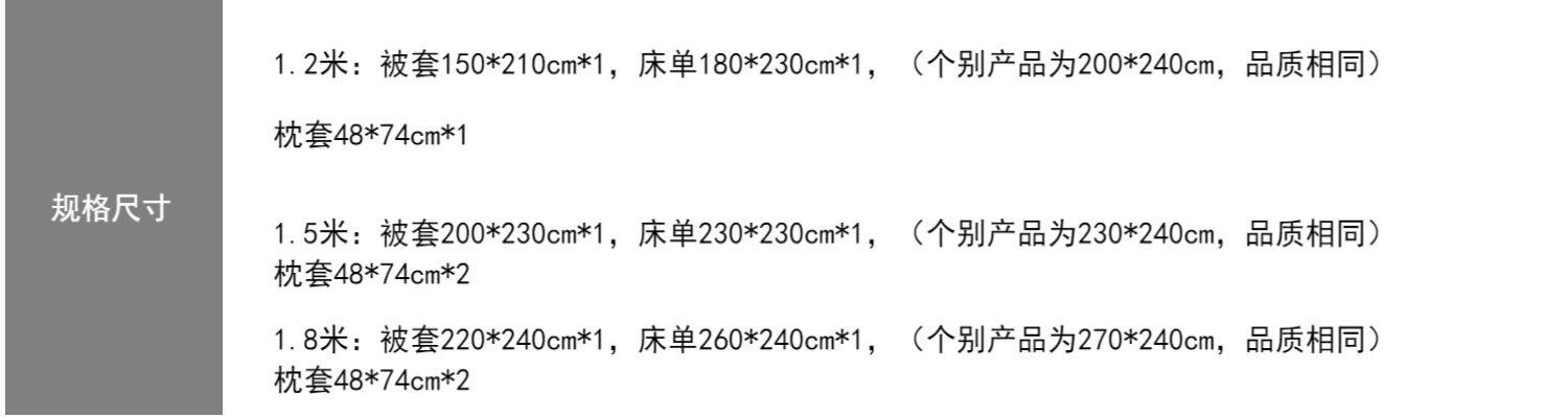 | Ширина кровати: | Три -набор для кровати применимо к 1,2 млн. С 150*210 стеганым одеялом, Четырехэтажный набор применимо к 1,5 -метровым кроватям и рекомендуется с 200*230 одеялом, Набор из четырех частей применим к 1,8-2M-кроватям, с 220*240 ядрами |