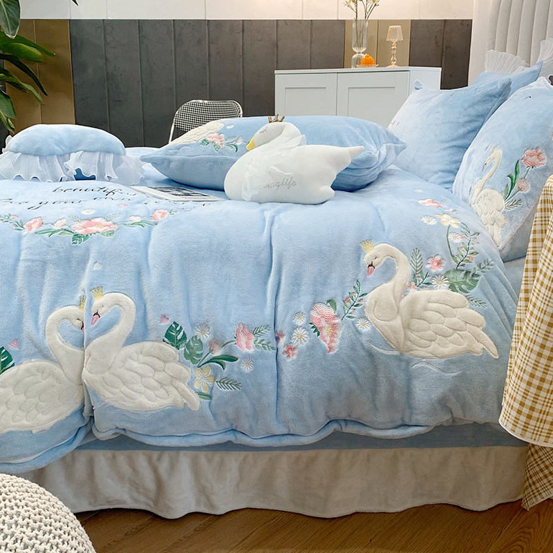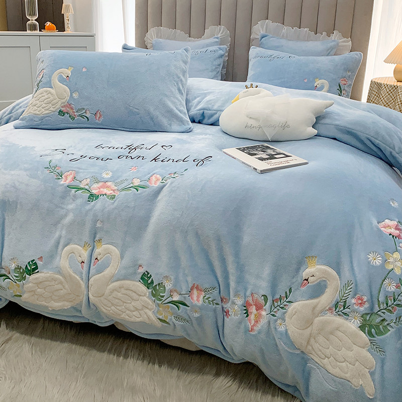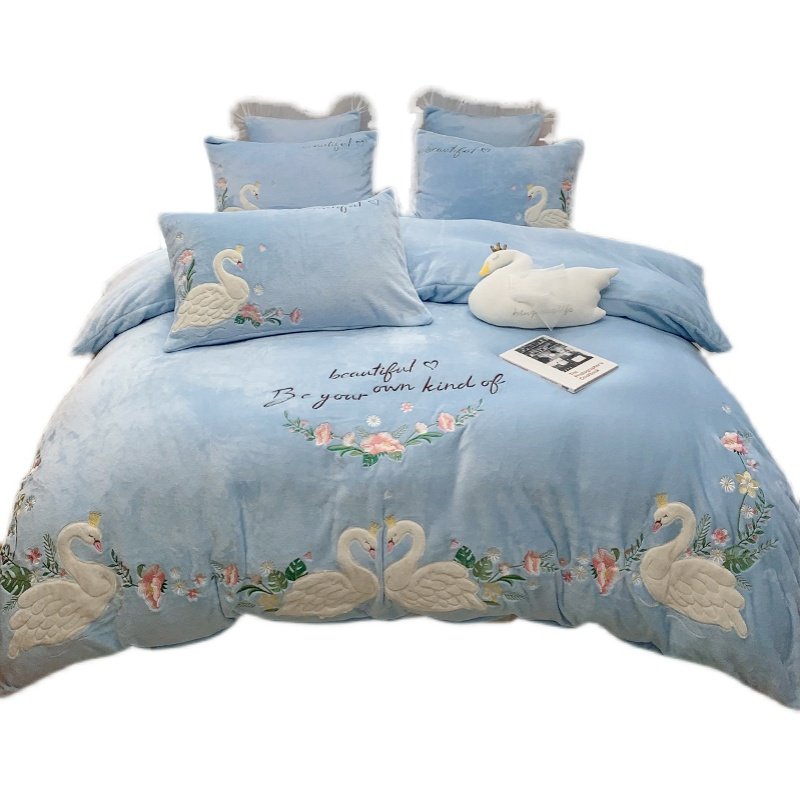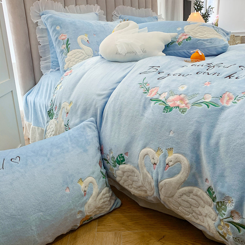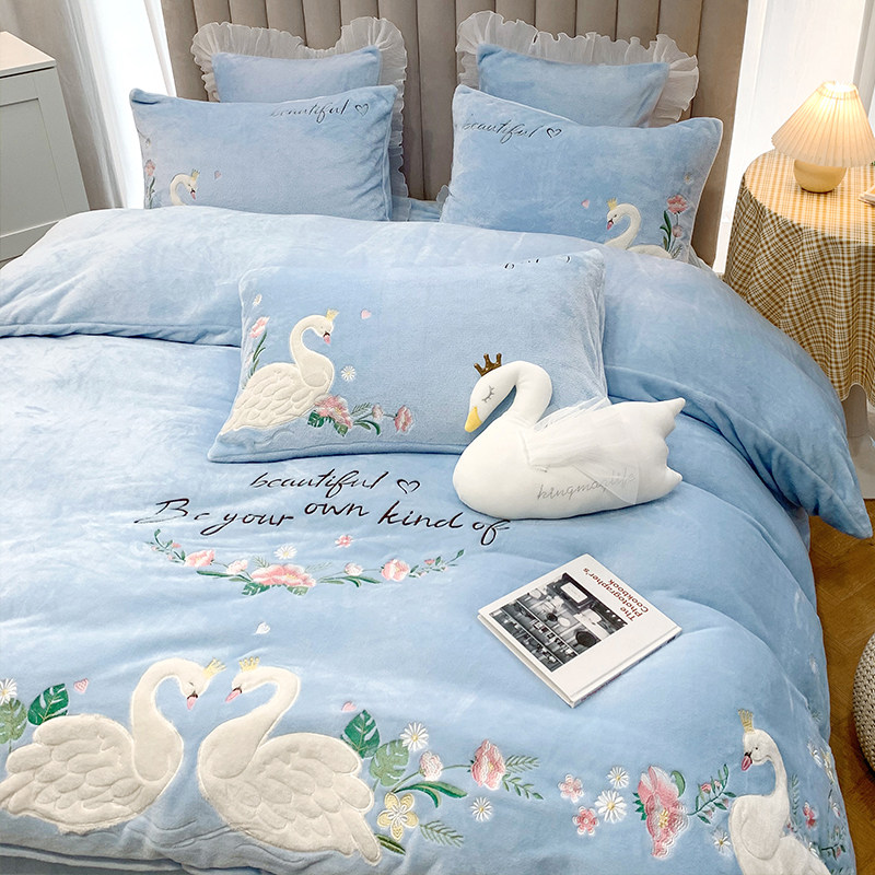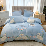 Детский лебедь, синий комплект, коралловый пододеяльник, простыня, с вышивкой, 4 предмета, легкий роскошный стиль, постельные принадлежности