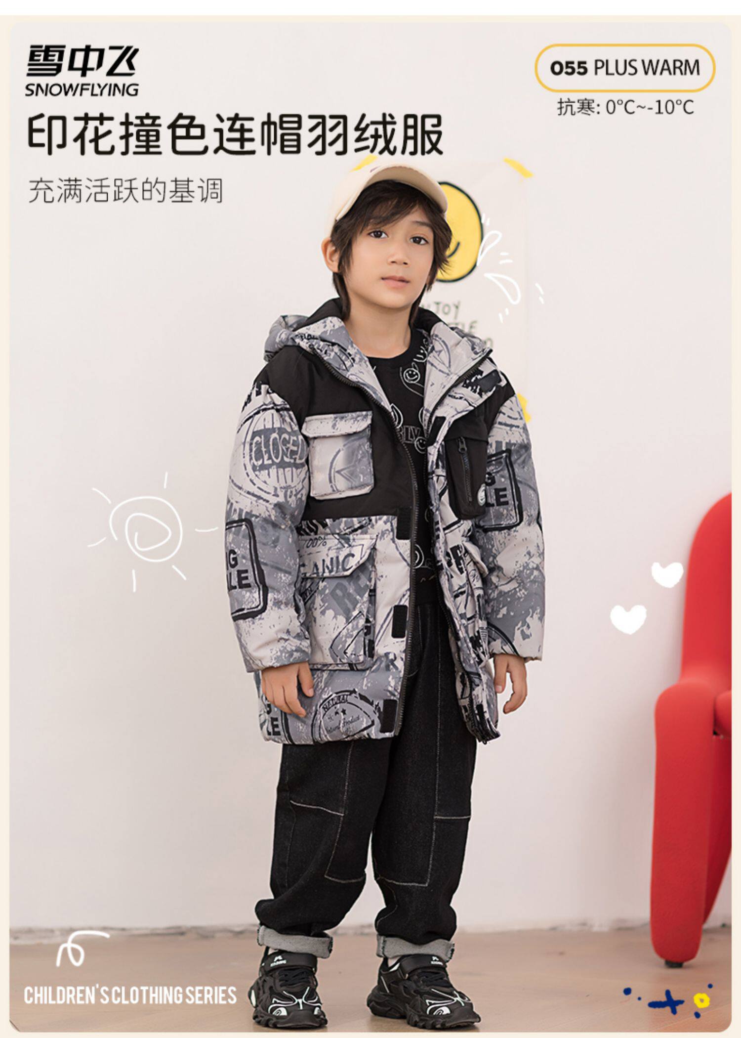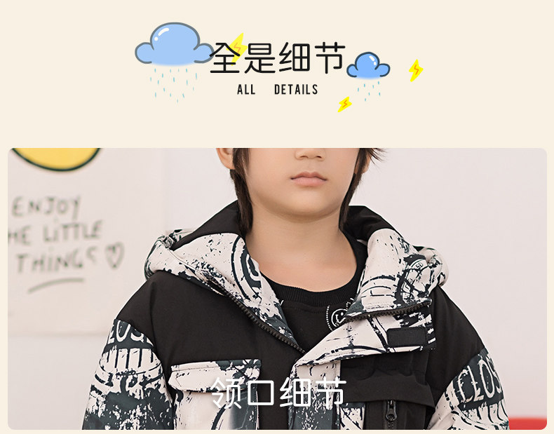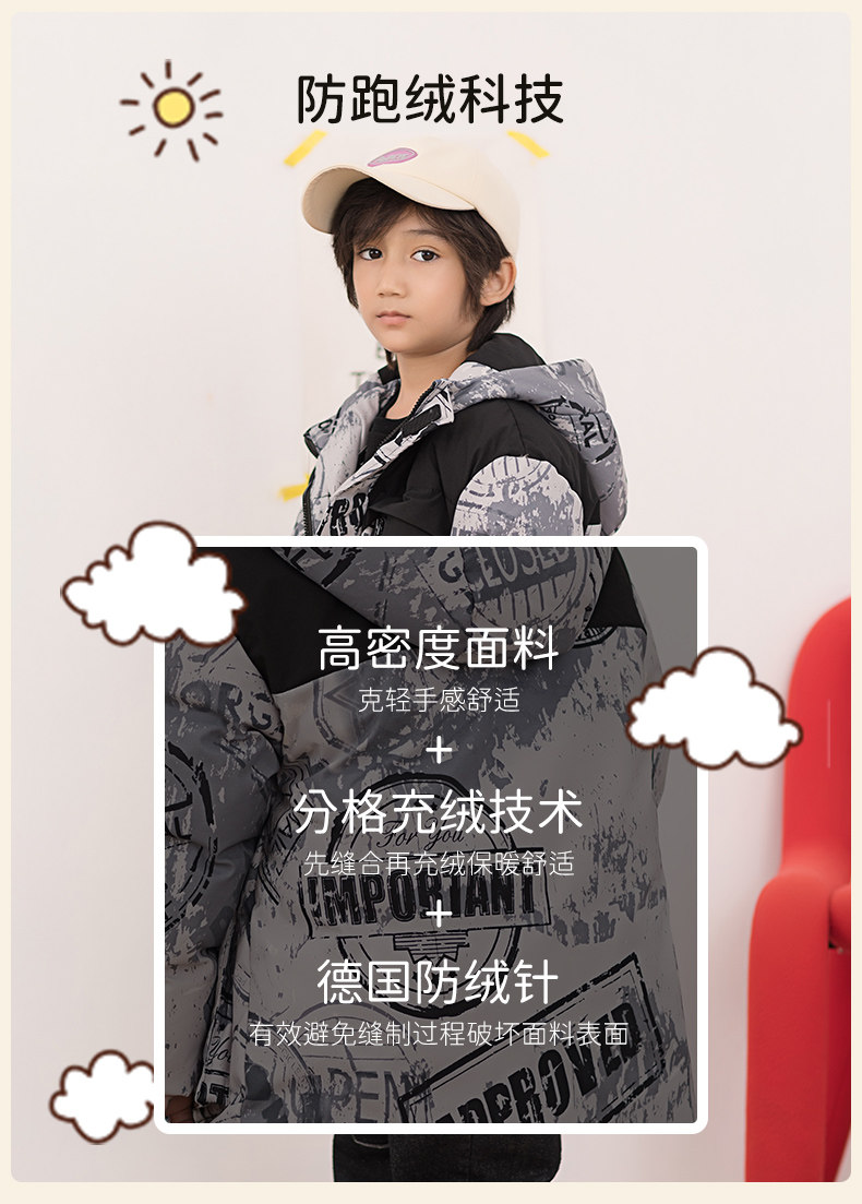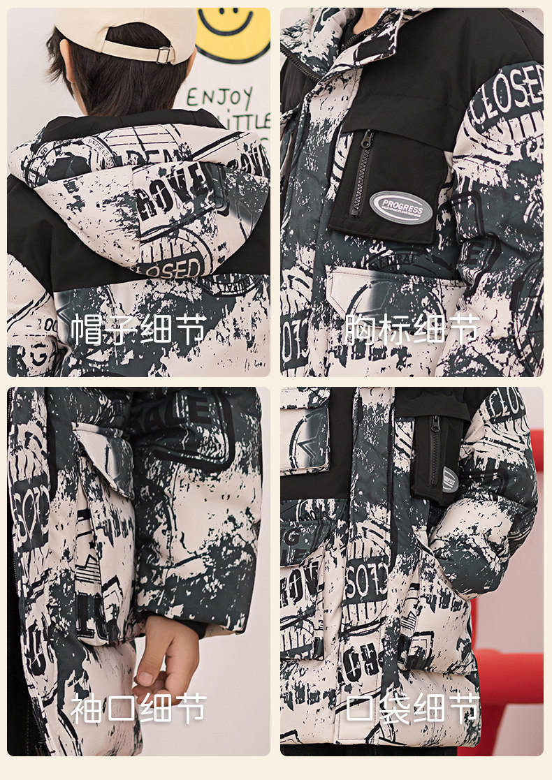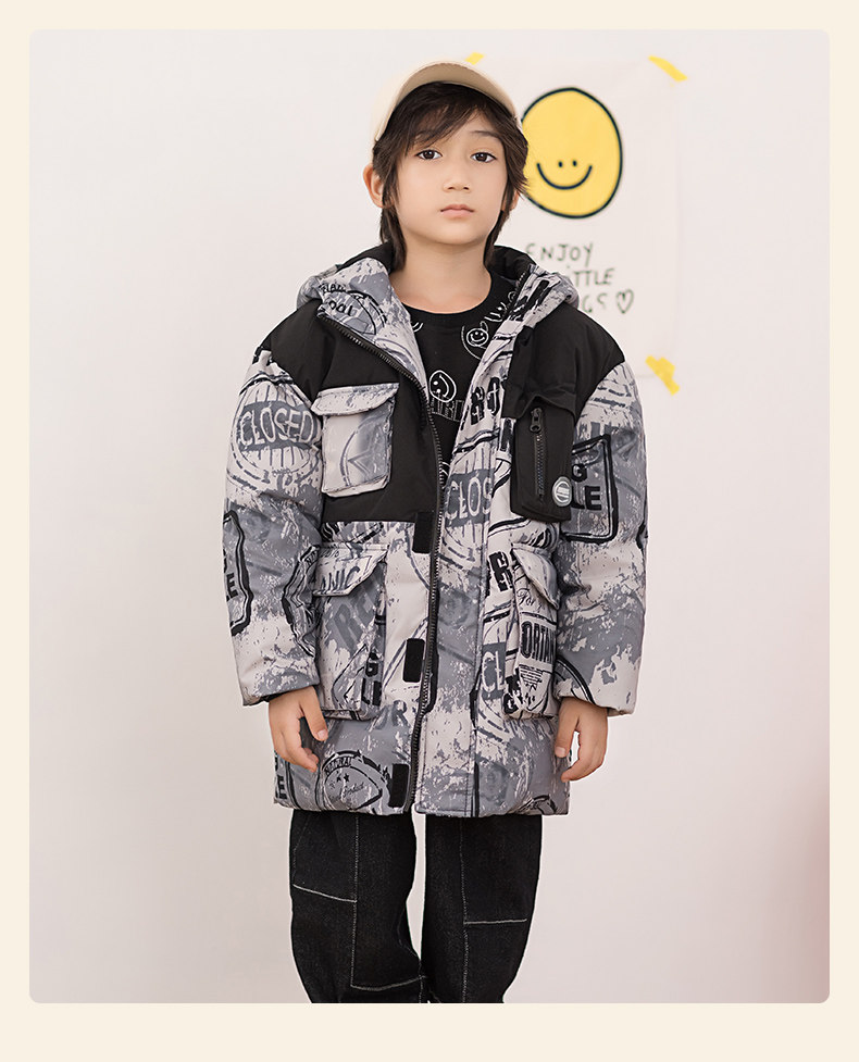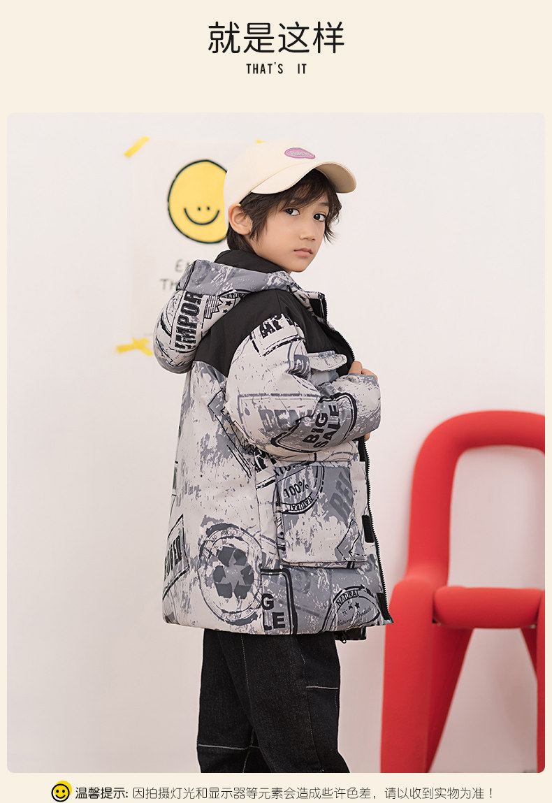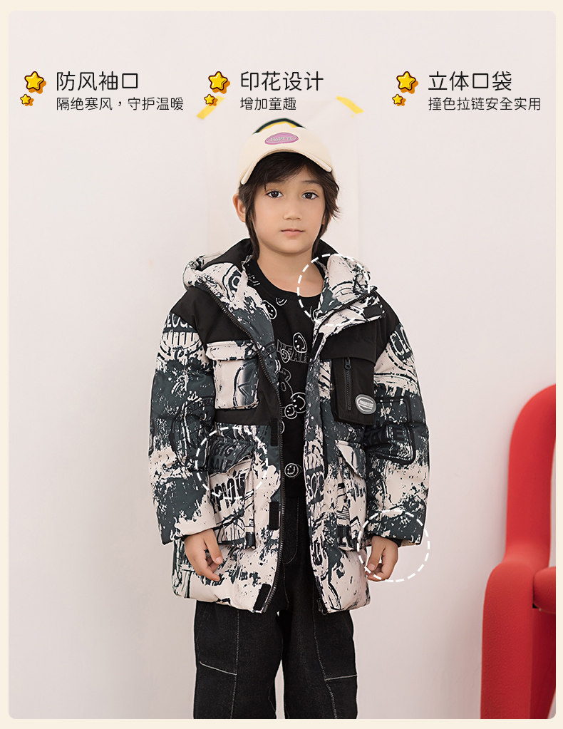 Демисезонный трендовый дизайнерский ветрозащитный детский пуховик для мальчиков для отдыха с капюшоном, принт, тренд сезона