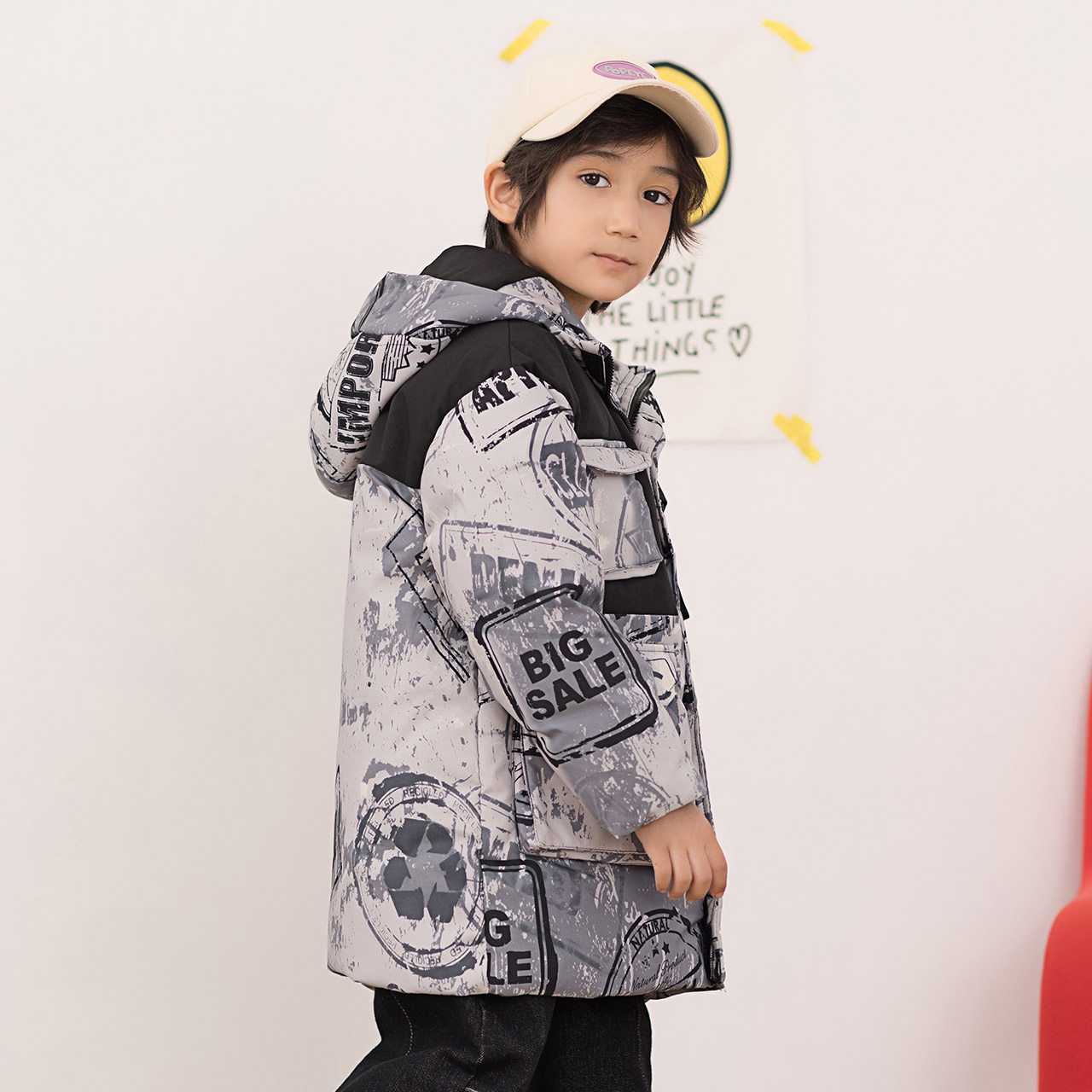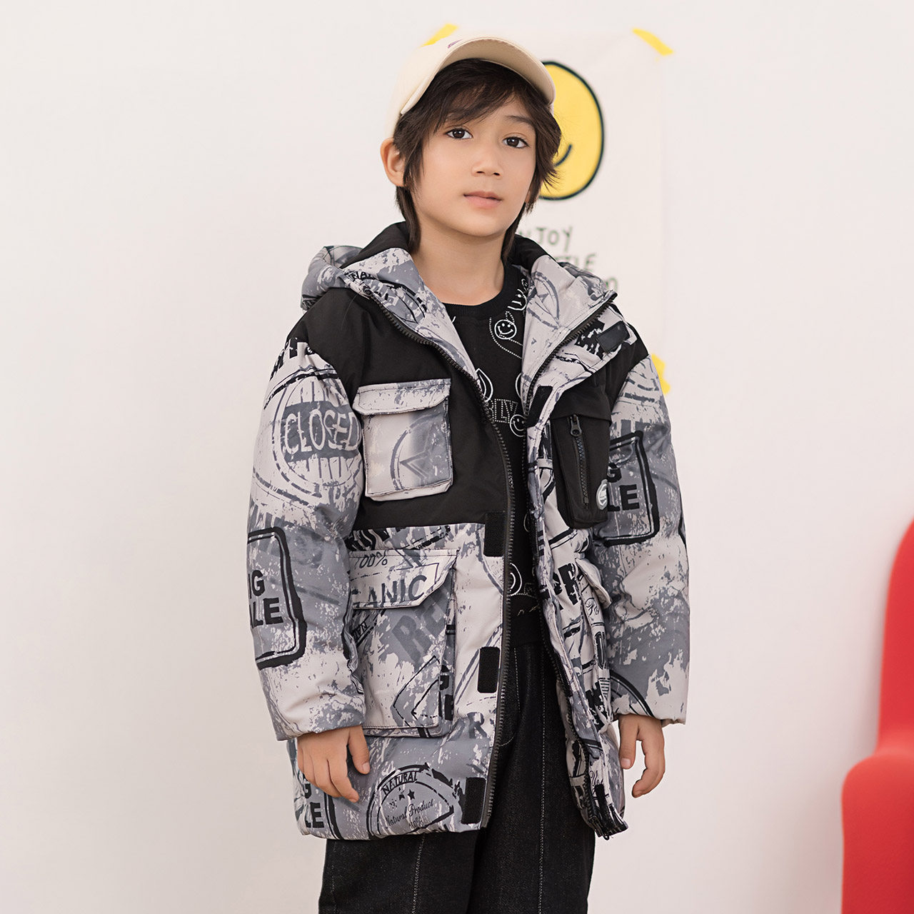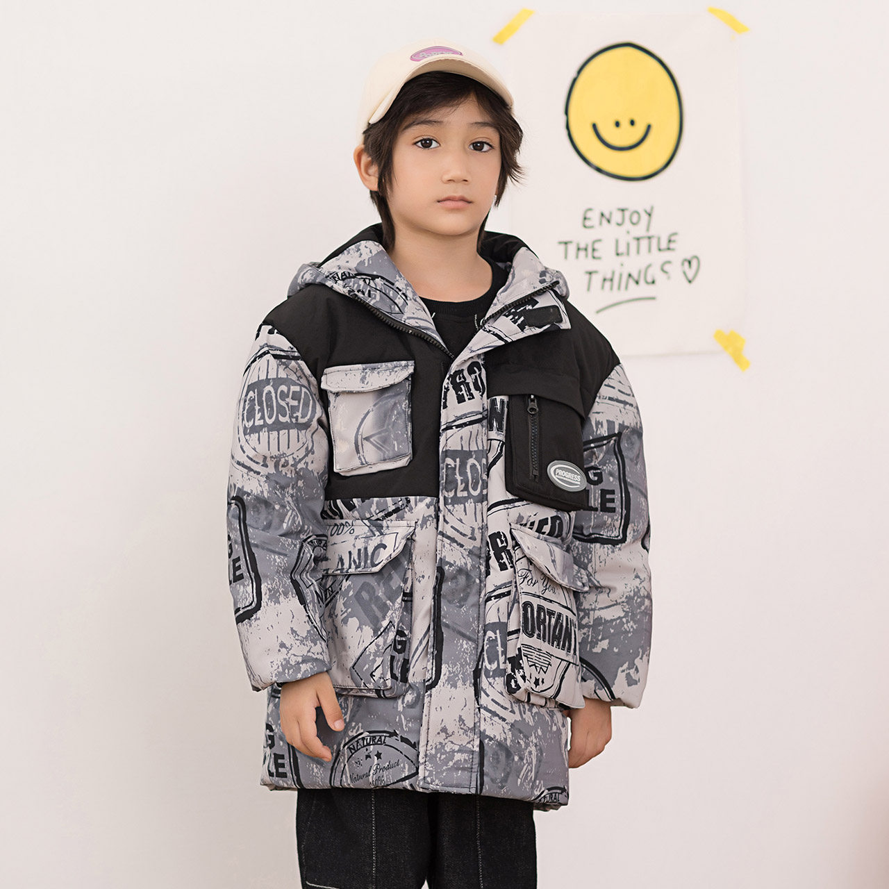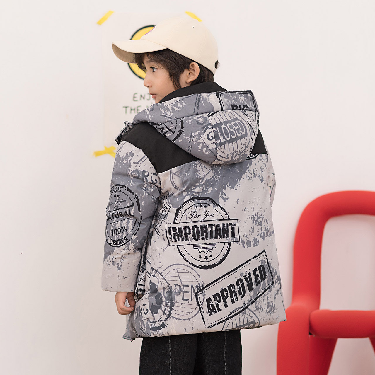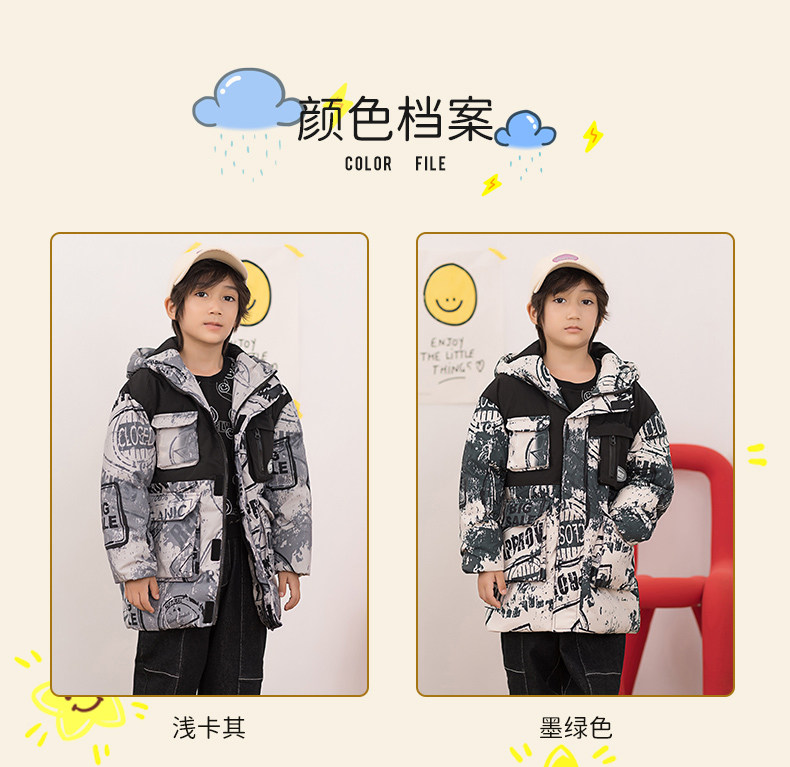 Демисезонный трендовый дизайнерский ветрозащитный детский пуховик для мальчиков для отдыха с капюшоном, принт, тренд сезона