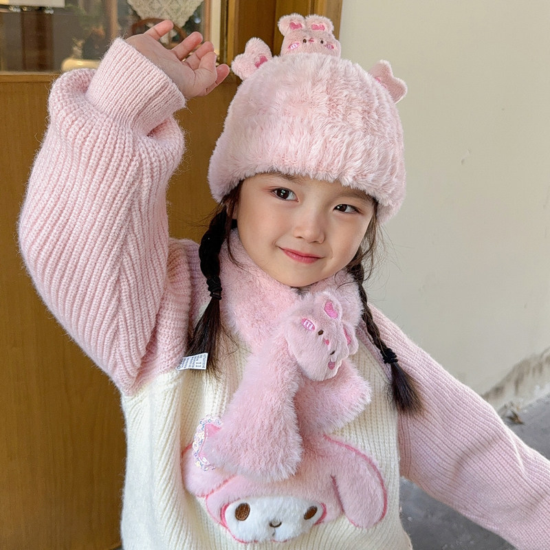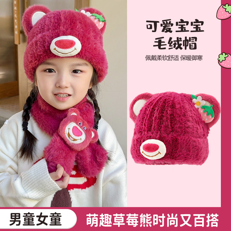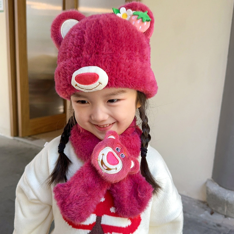 - 9 # меховой шарик, клубничная шапка с медвежонком + шарф