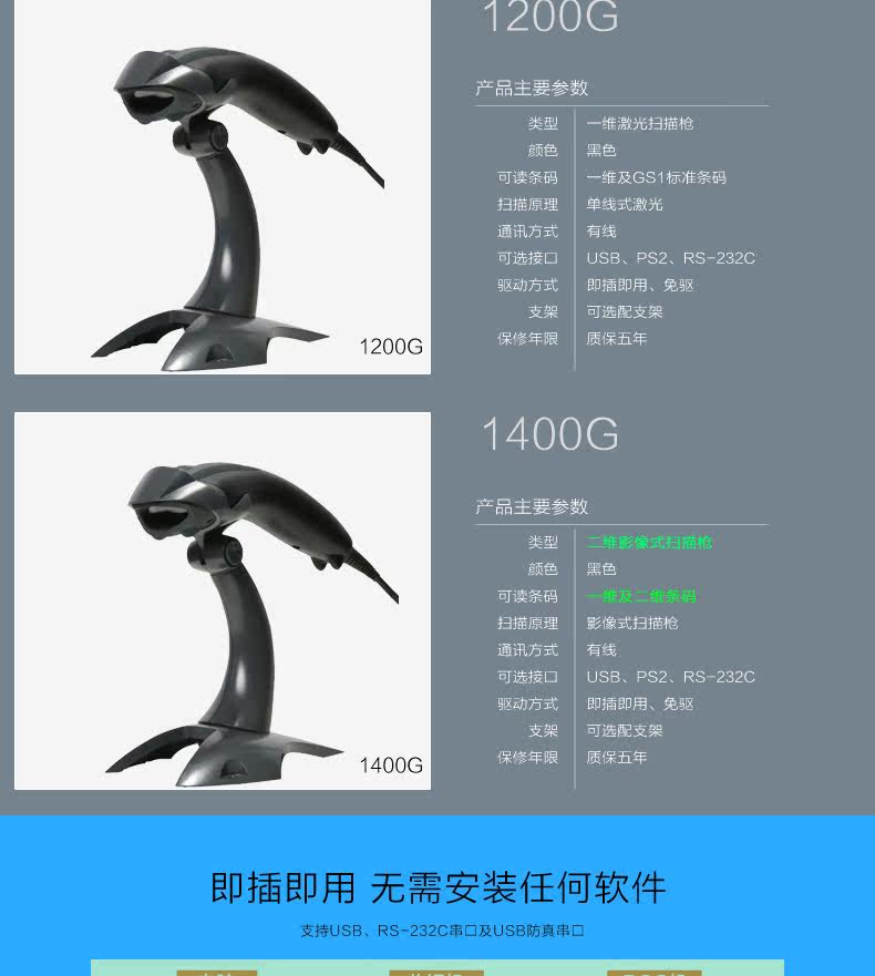 - 1400G2D-2-2USB-1 Одномерный+двумерный/сканированный экран/стент/гарантия Пять лет/USB-порт
