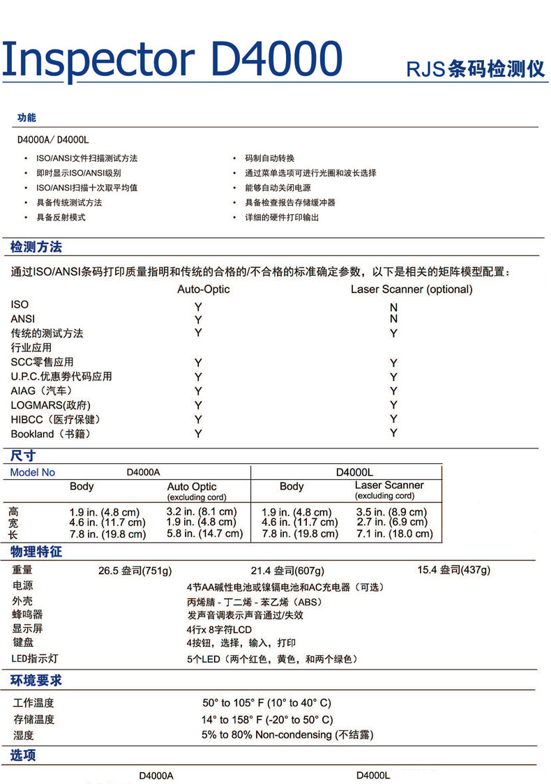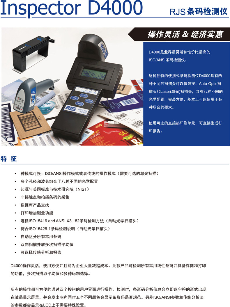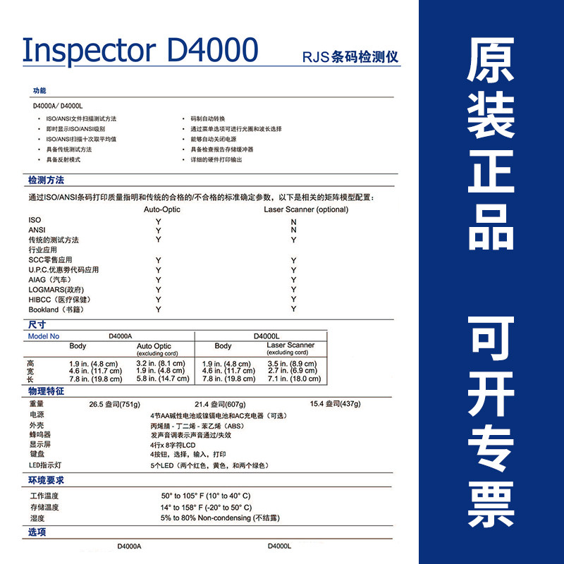/Лазер: D4000, оснащенный лазерным сканирующим головкой, является чрезвычайно простым в использовании сканера. Он не требует никакого обучения. Он может анализировать многие основные параметры штрих -кода для расчета скорости декодирования и процента декодирования.