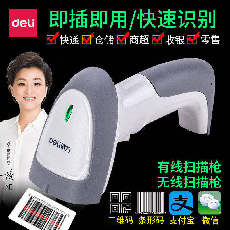 Deli Supermarket One-R кодовой сканирующий пистолет USB-код сканирующий штрих-код штрих-кода беспроводной лазерный штрих-код экспресс экспресс-поставка заказы на код супермаркета сканирование