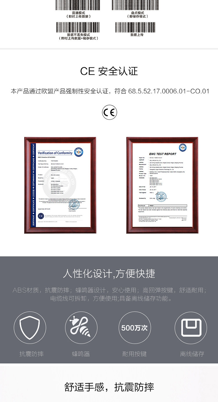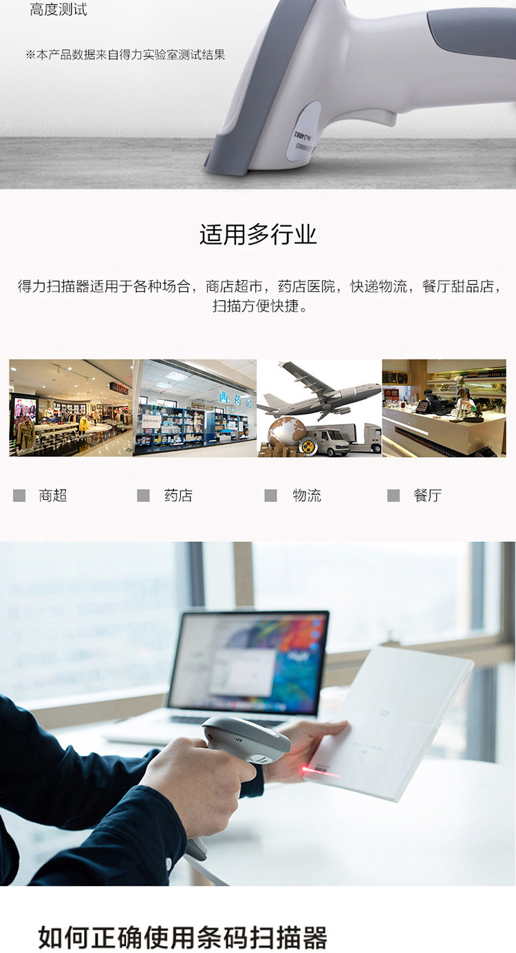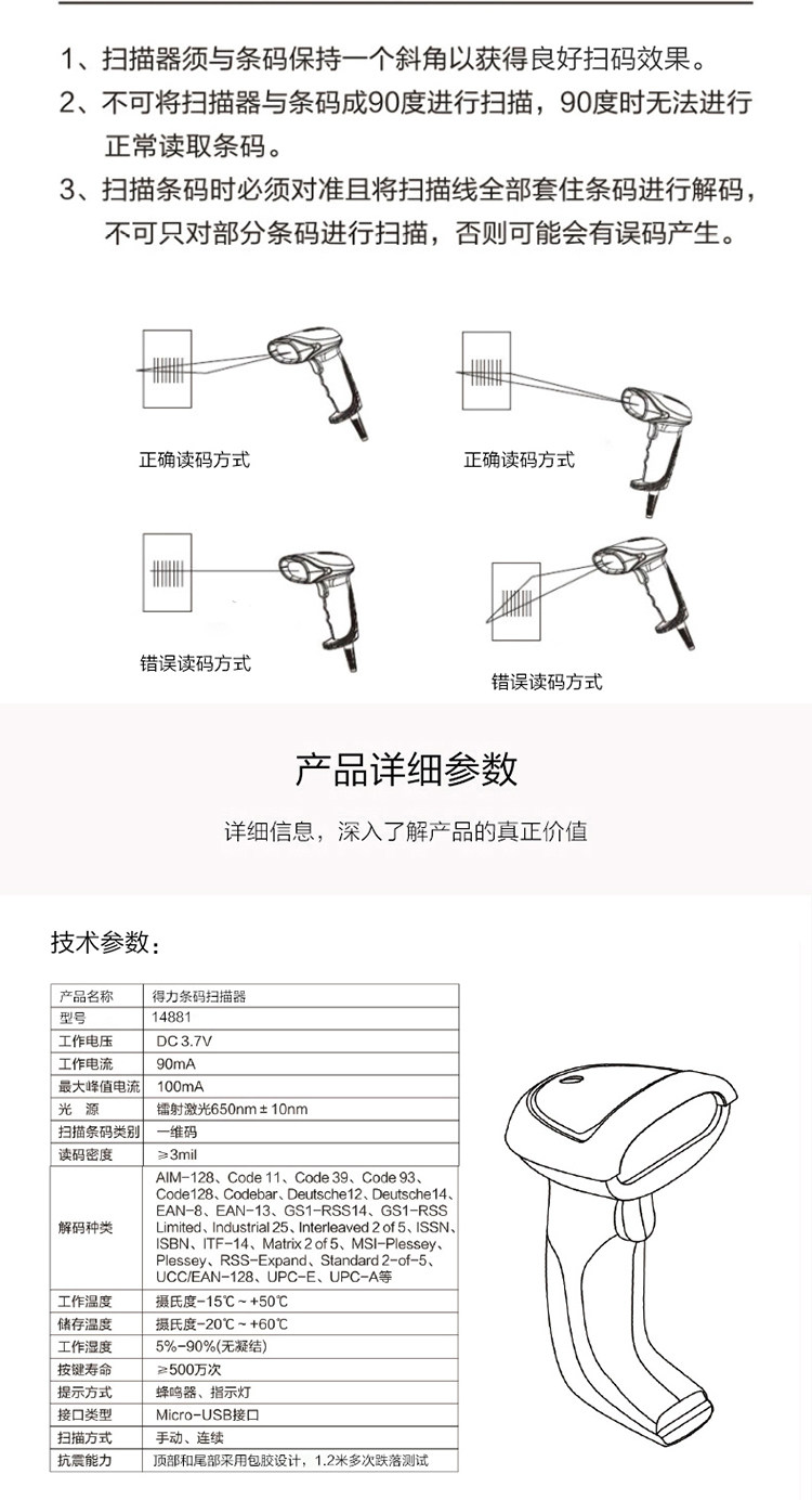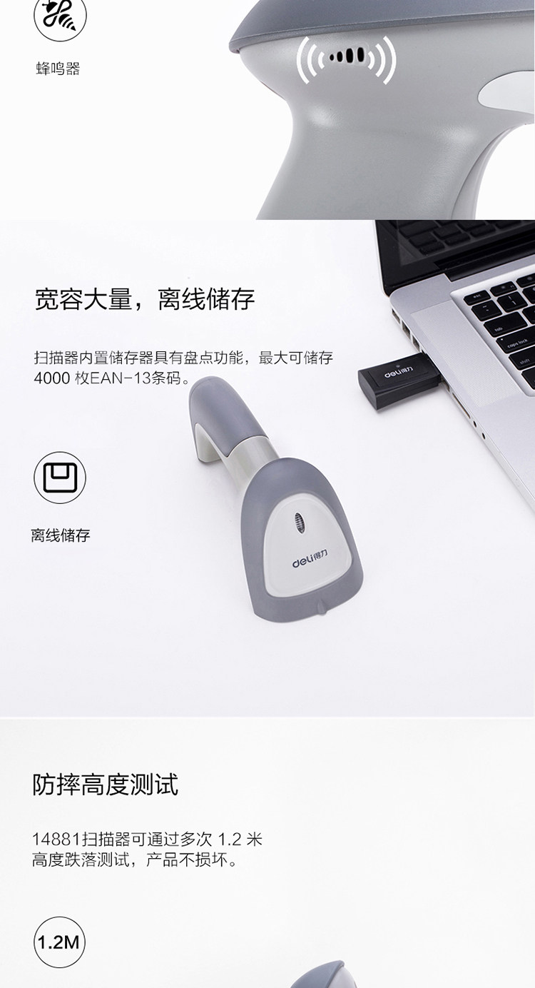 Deli 14881 Беспроводной сканирующий пистолет Один -размерный код e -commerce courier -code Soursmarket Scanter Scanter распознавание лазера