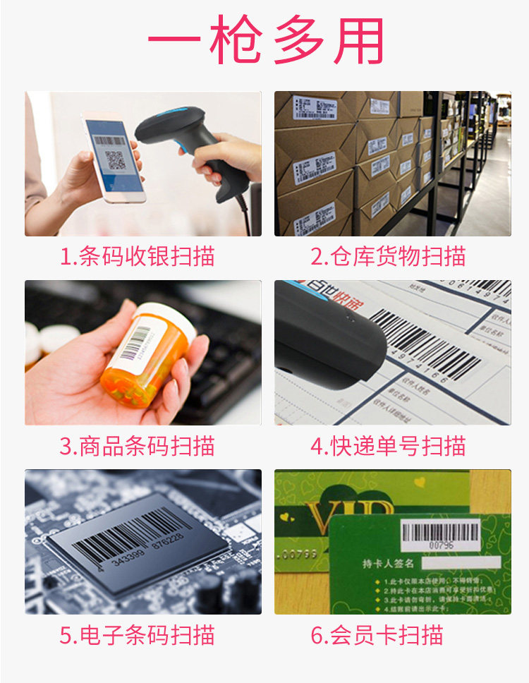 Существует беспроводное сканирующее оружие, в котором есть кассир супермаркета в -ут в -depth кодов, сканирующие орудие USB -линия QR -код выход Alipay кассир кассир инфракрасный лазерный сканирующий пистолет