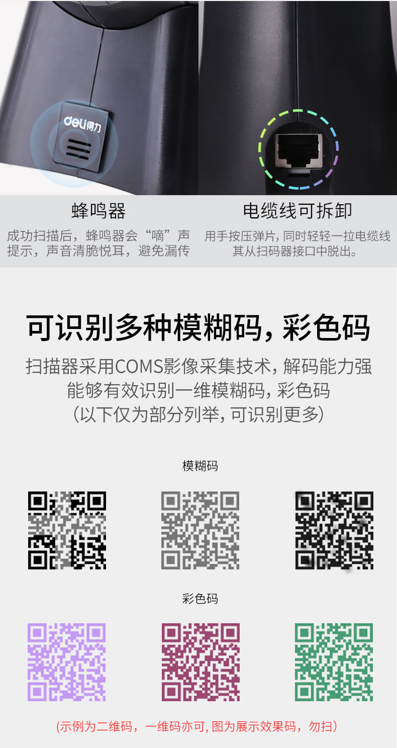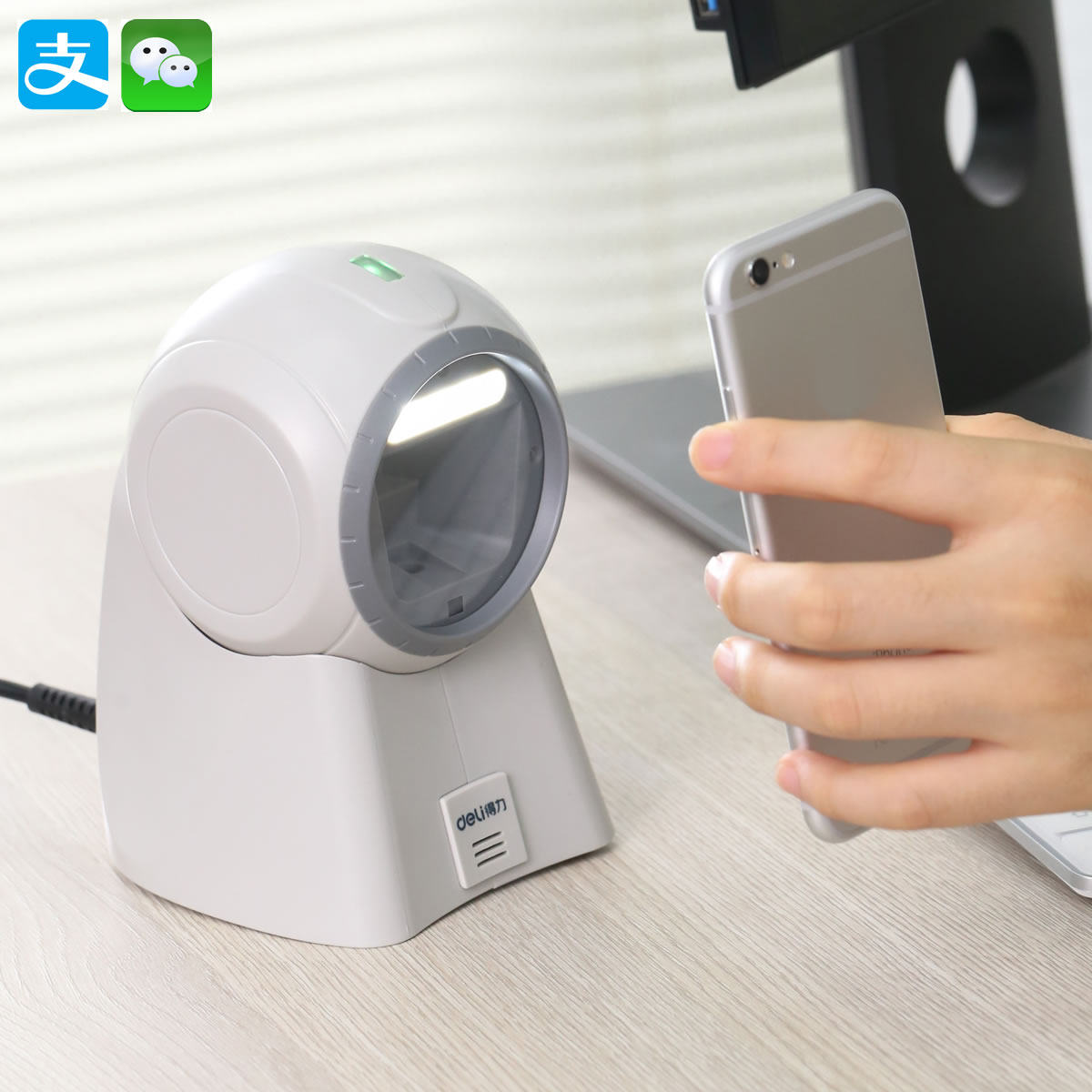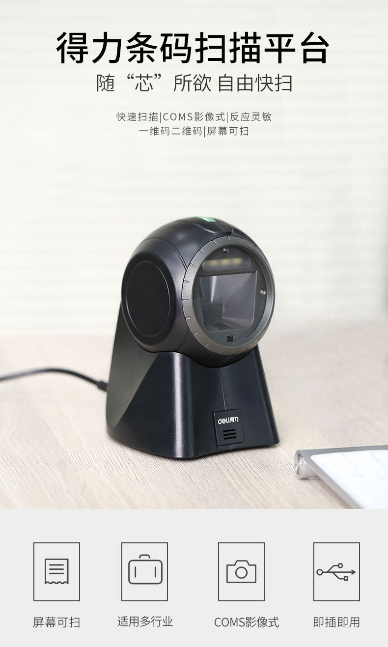 Deli QR -код сканирующего платформы супермаркета Кассовый реестр сканер один -дивминный код изображения Сканирование изображения Платформа WeChat Alipay квитанция Код кода платеж