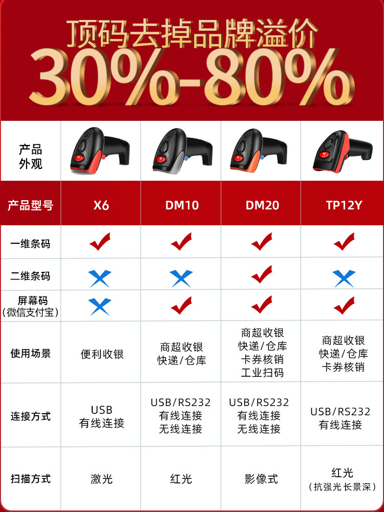 | Цвет: | X6 Wired+штрих -код+лазер, DM10y Wired+Barcode+красный свет, DM10W+штрих -код+беспроводной+красный свет, DM20y Wired+Sarcode+два -мерный код+сканирование изображений, DM20W Wireless+штрих -код+два -мерный код+сканирование изображений, TP12Y Wired+Barcode+не страх перед сильным светом+красный свет, TP7190 Wired+Self -Induction+два -мерное изображение, TP7120HD Wired+High Secret+два -мерное изображение |