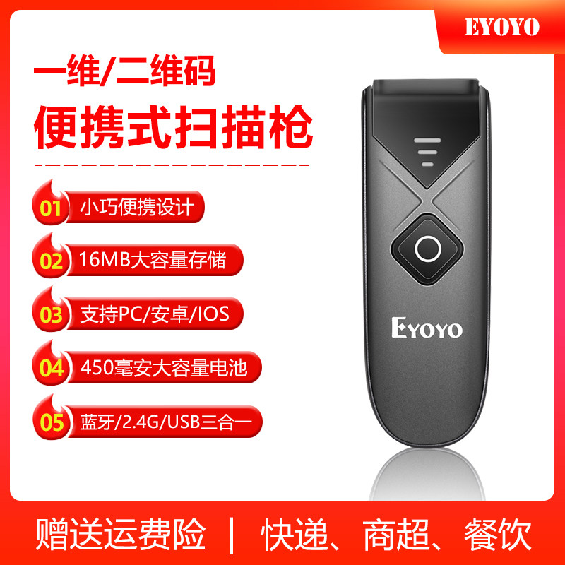 Портативный сканер EYOYO 1 сканер QR-кода Courier Суперспециальный сканер штрих-кода USB Беспроводная связь Bluetooth 3-в-1 Встроенный перезаряжаемый аккумулятор емкостью 450 мАч и встроенная память 16 МБ