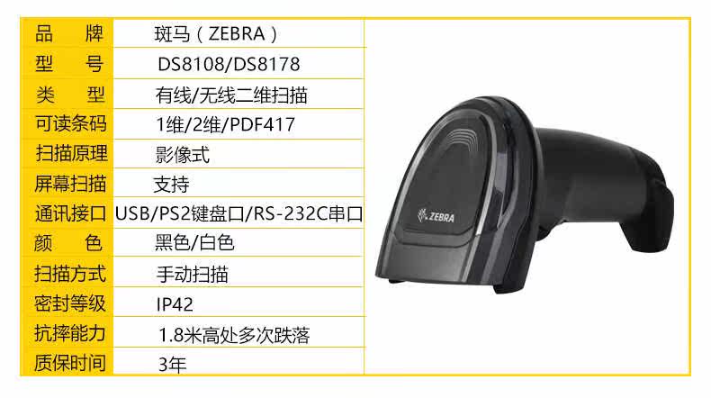 Zebra Zebra DS4608-SR/XD/HD/DS2208/1001/4308 Двумерное проводное сканирование код сканирования оружия