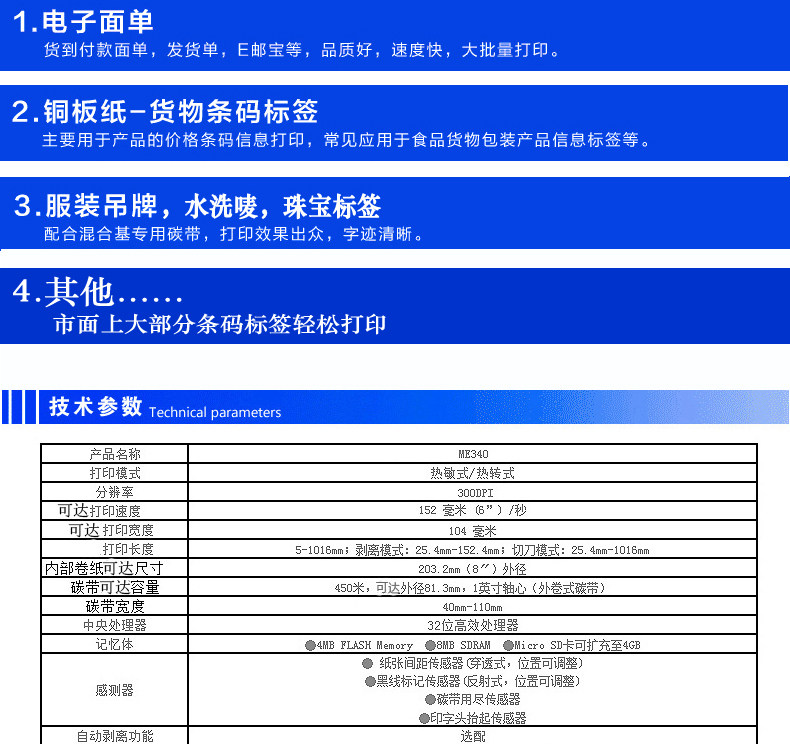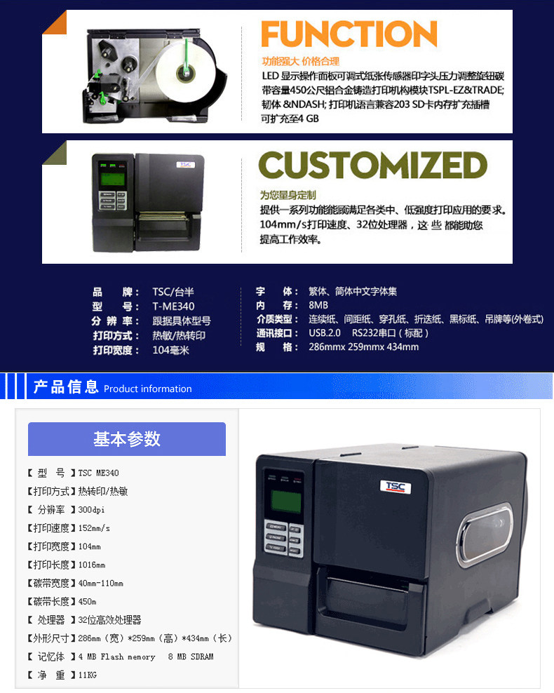 TSC ME340 Tag Tag Промышленная принтер термическая теплопередача Электронная лапша.