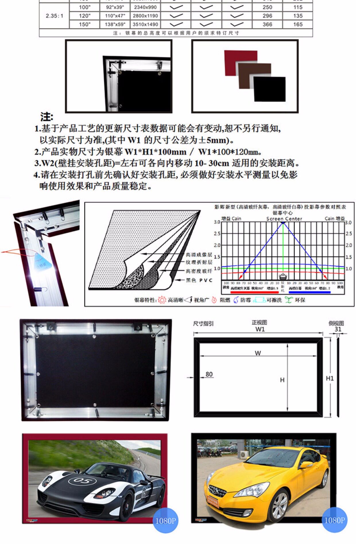 Фоторамка, 92 дюймов, 100 дюймов, 106 дюймов, 120 дюймов, 133 дюймов, 150 дюймов