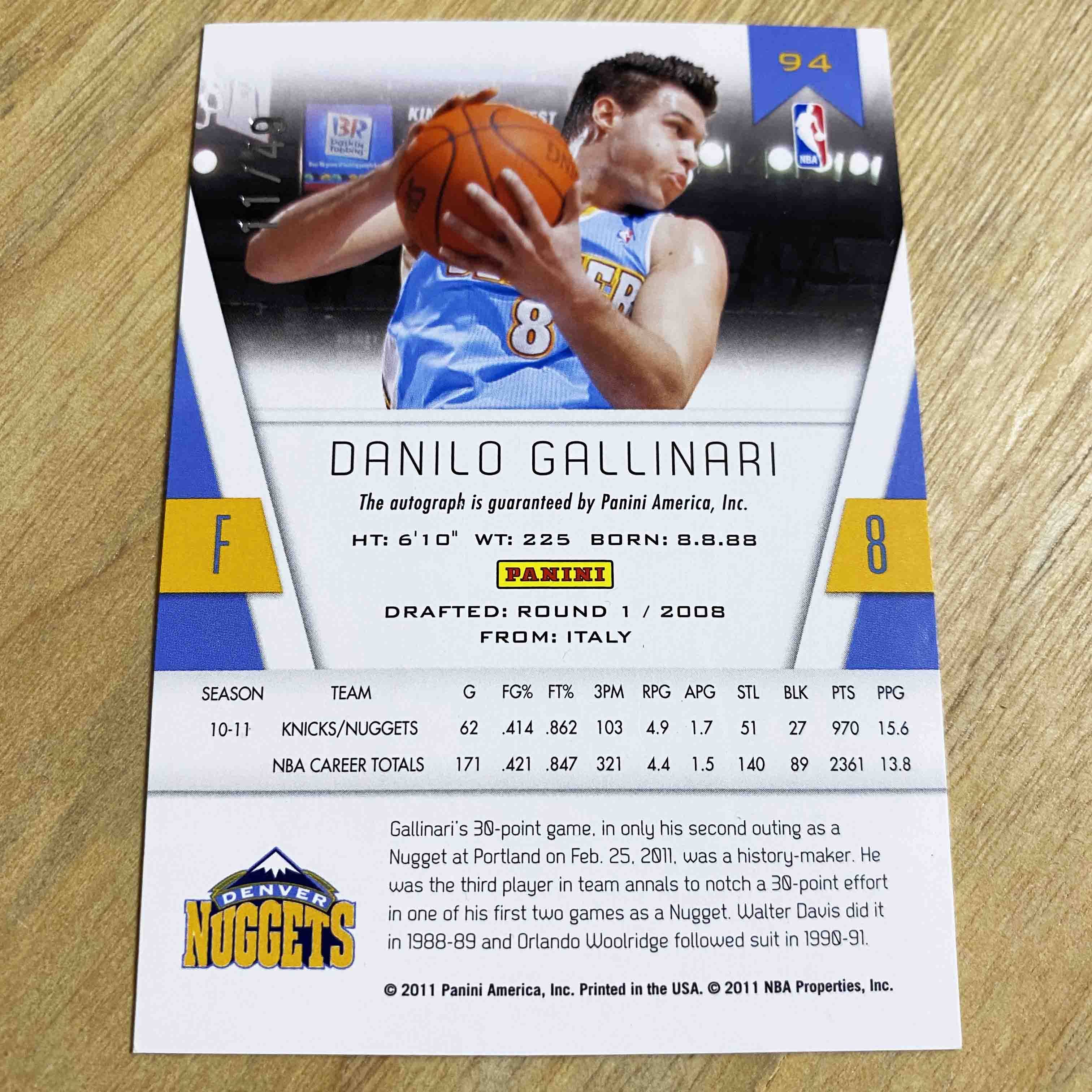 ★ Gallinari Garnali Италия ★ 11PanIcertify Limited Signature Star Card 94