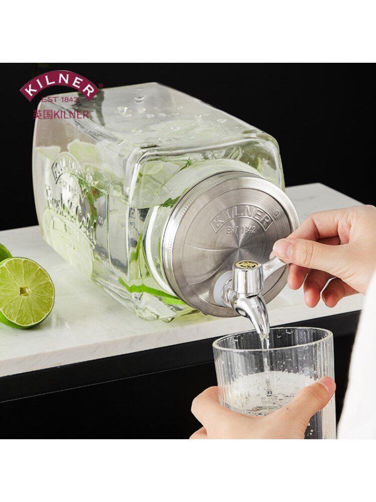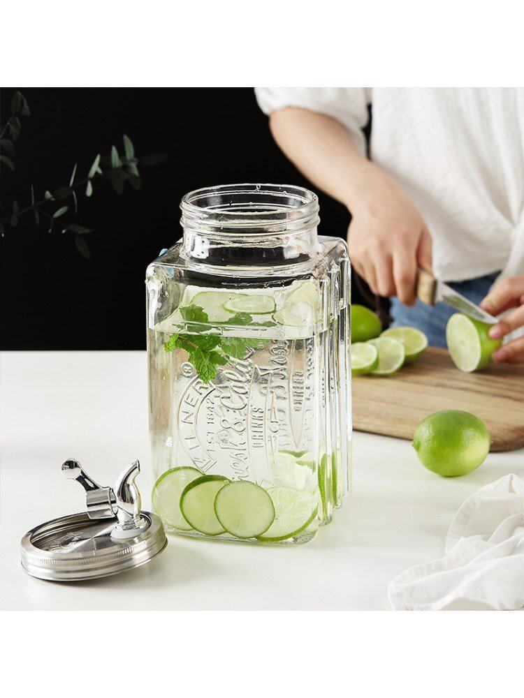 Стекло из бутылочных напитков ведро с водным краном, сок сока холодильника, высокий холодный напиток.