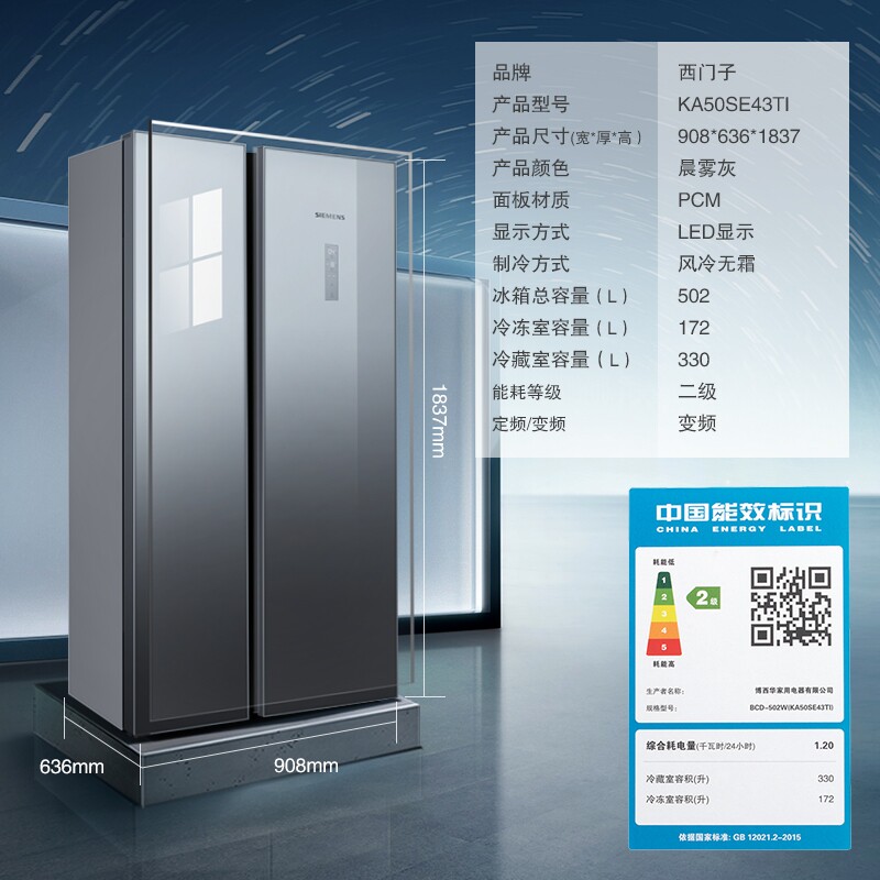 SIEMENS/西门子 Ультратонкий встраиваемый неморозостойкий холодильник с воздушным охлаждением и двойной стеклянной дверью KA50SE43TI