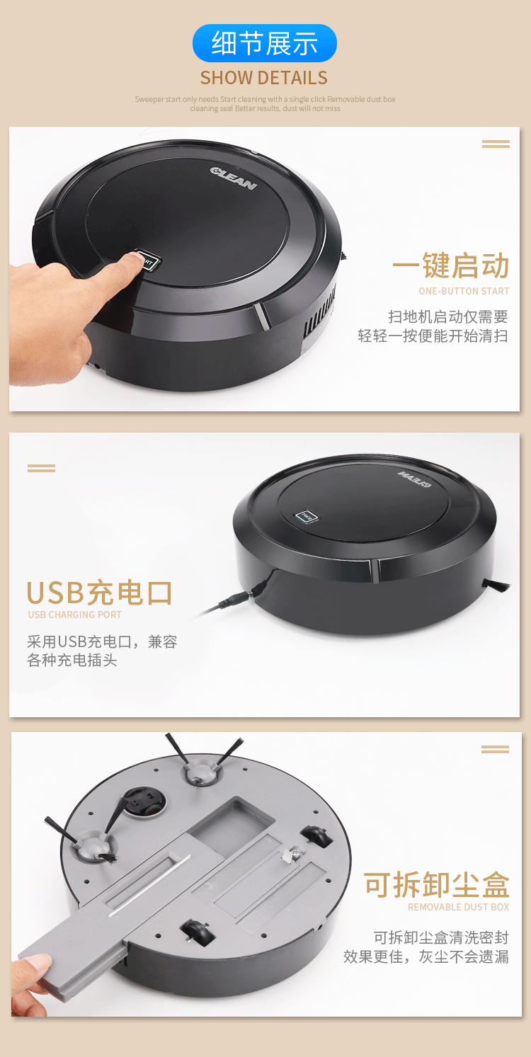 Функция продукта: встроенные в литиевые батареи, кнопки световых переключателей, адсорб -пыли волос, автоматическое изменение направления и т. Д.