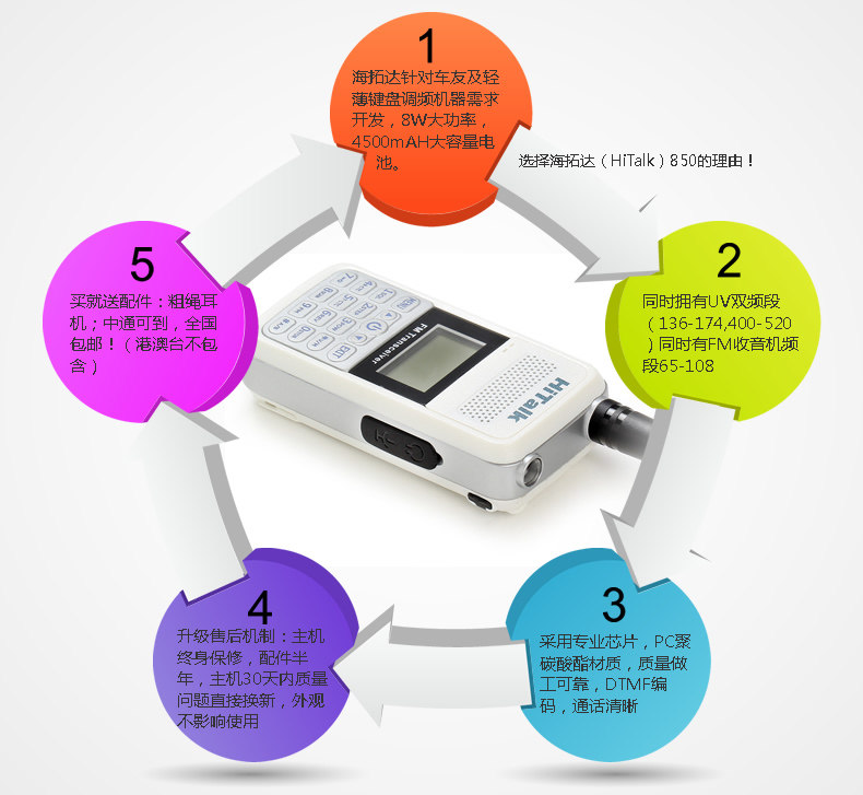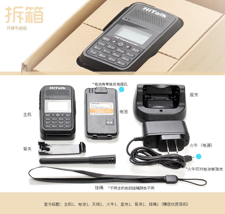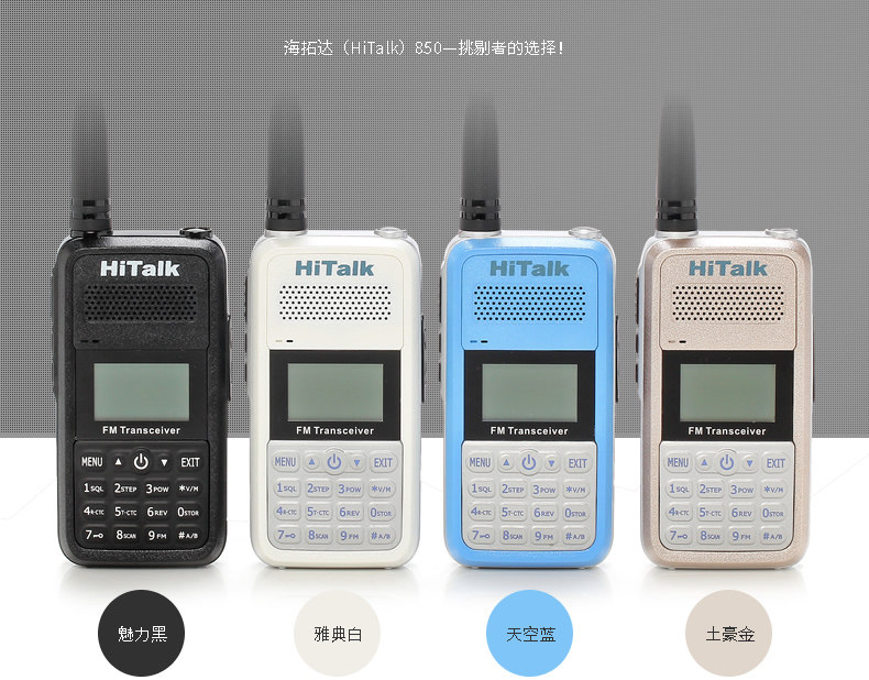 Hitalk 850 - это недавно легкий и легкий профессиональный регулятор частоты.С экраном китайского дисплея, дисплея времени, характеристики двойного сегмента, двойного частота, двойного дисплея, двойного ожидания, с мощными функциями, такими как светодиодный сильный фонарик, FM -радио, дисплей мощности и другие мощные функции.Подходит для гонщиков, ослов, недвижимости, торговых центров, доков и т. Д.Мощность: 8 Вт, батарея 4500 мАч, вес: около 170 г, объем: около 50 ** высота 98*Толщина 25 мм