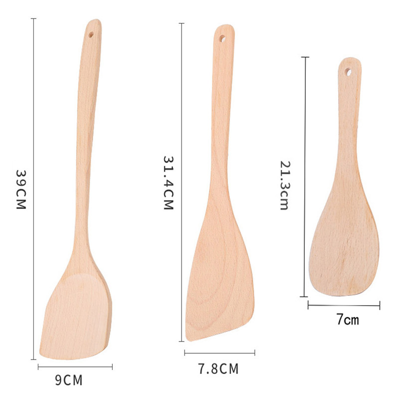 - Ложка для риса из бука 21,3 см + большая лопатка для жарки 31,4 см + большая лопатка для кастрюли 39 см
