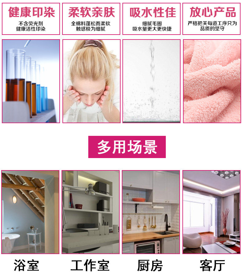 Новичок в больших банях, хорошем поглощении воды, без выпадения волос или цвета, мягкой и нежной кожи, есть две спецификации, которые составляют 60x120 см. Полотенцы увеличиваются.