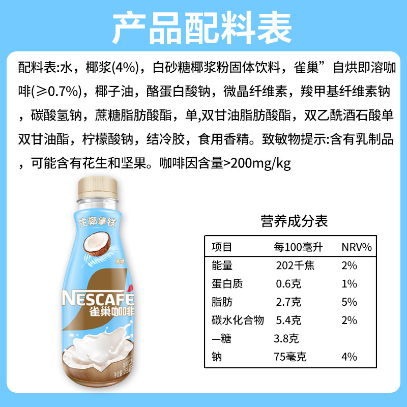 Готовый к употреблению кофе Nestlé, сырой кокосовый латте, 268 мл * 6 бутылок кофейного напитка, кофе с молоком с низким содержанием сахара