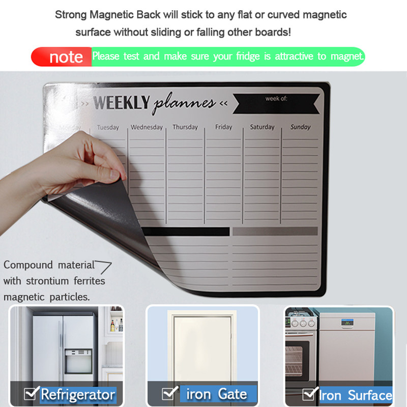 Эта доска магнитная, придерживайтесь металлической поверхности. Написание, сухая вытирание легко в очистке, установка проста, вам просто нужно поставить его на холодильник и другую металлическую поверхность.