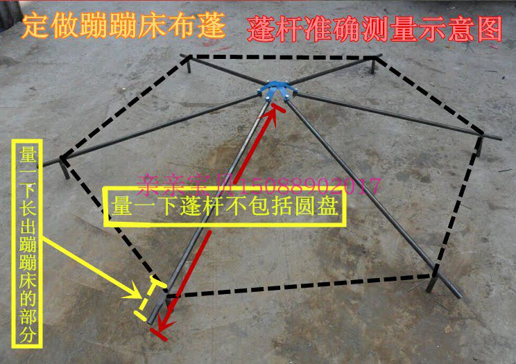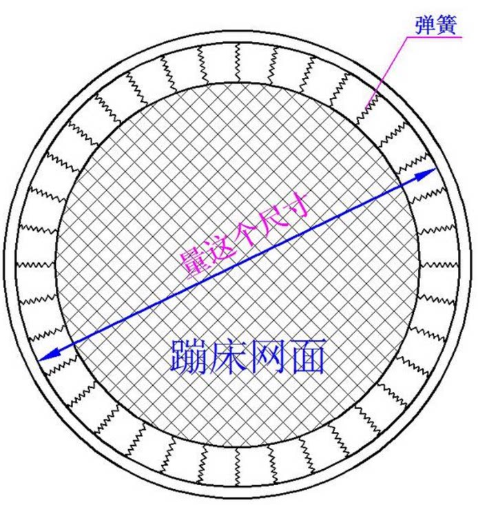 Круглый батут должен обеспечить внешний диаметр и измерить внешний диаметр железной рамы.Бобен должен знать длину слойки (будь то батут, сколько превышает).