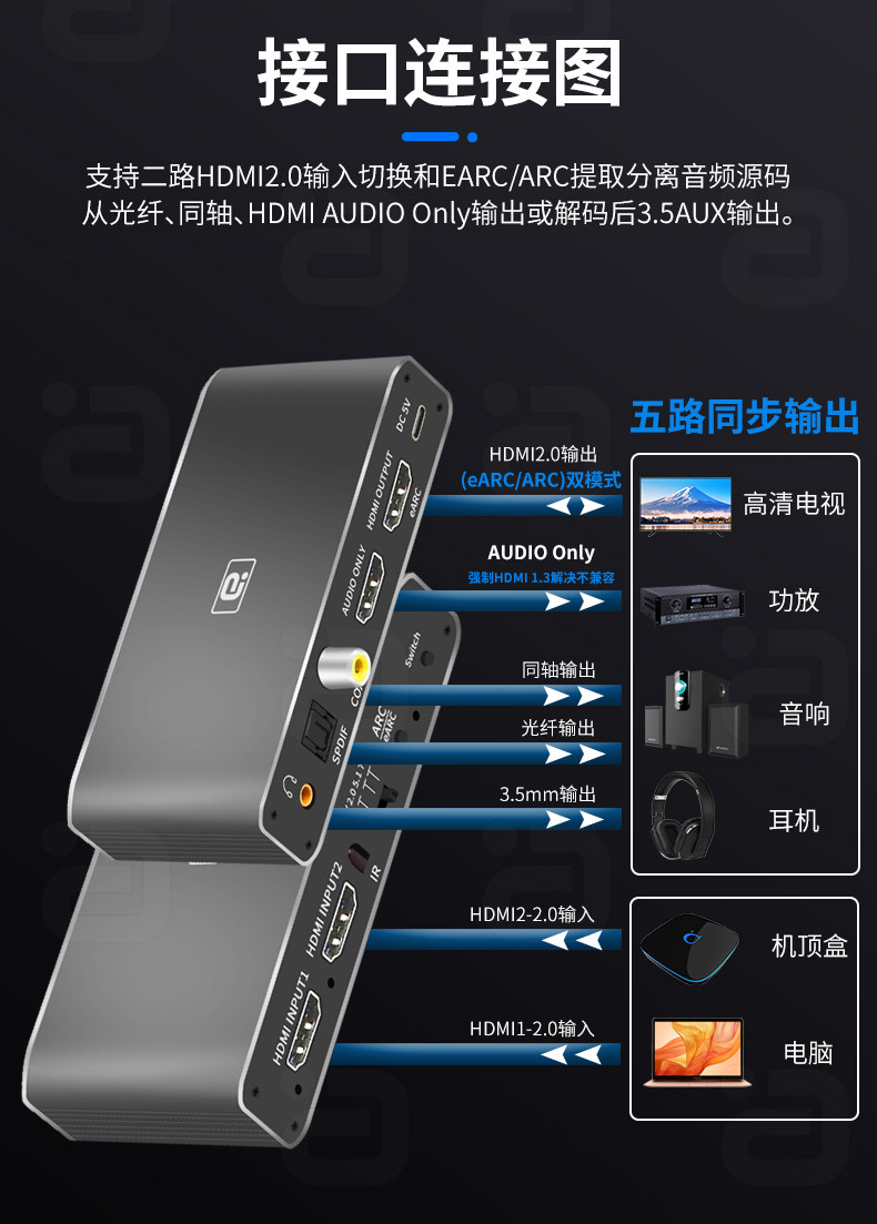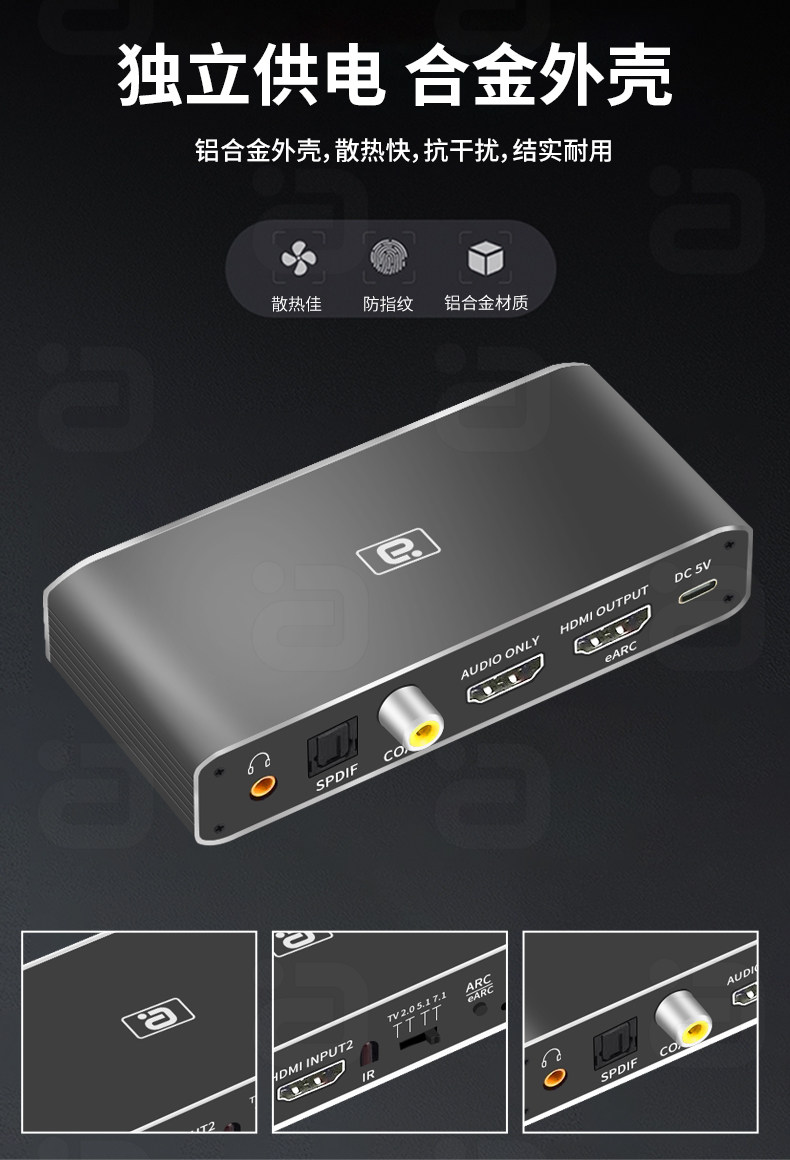 HDMI Two-in-One-One Switch Earc Audio Разделение 8K Высокопроницаемое разрыв HDCP до волоконного коаксиального звука и синхронизации видео