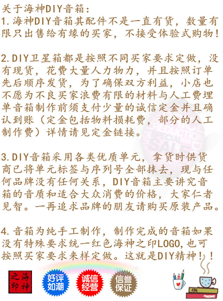 DIY -динамик должен пройти слои до продажи, включая досрочную консультацию небольших техников -магазинов до покупки покупателя, ранней покупки, проектирования схемы защиты частоты, производства DIY -динамиков, завершение Тест динамика после завершения теста динамика после завершения, плотно упаковка перед доставкой, курьер -бронирование на -door и другие ссылки.Что самое дорогое в 21 веке?Ответ прост“Самое дорогое”ПересечениеПересечениеПоэтому, пожалуйста, берегите наши трудовые фрукты. Как правило, он будет отправлен в течение недели после бронирования, и заказ в порядке!DIY Works не принимает никаких средних или плохих отзывов, все проблемы могут быть решены путем переговоров!Для тех, кого не могут быть приняты, пожалуйста, не покупайте его, спасибо за понимание!