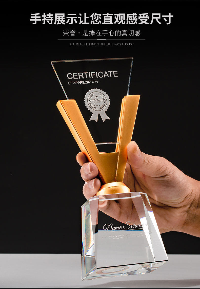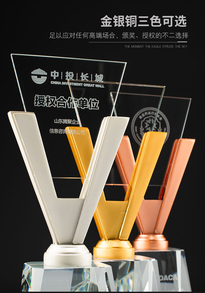Новая Creative V -форма Crystal Trophy Company Отличный сотрудник, золото, серебро, медная трехколорная траллейная тележка бесплатная гравировка