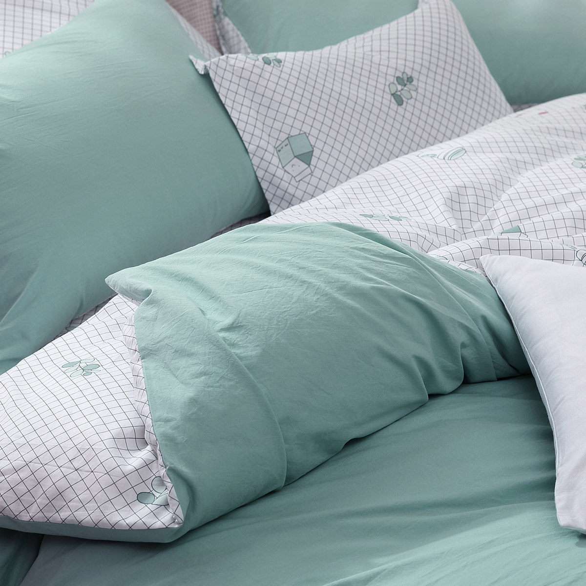 Набор четырех -купюр: лист*1 стеганое одеяло*1 рукав с подушкой*2 Упаковка*1