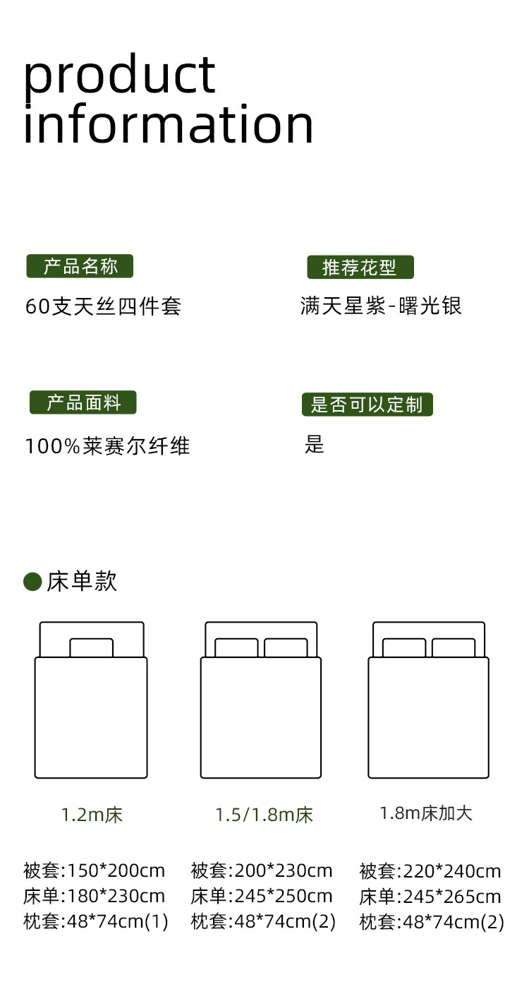| Ширина кровати: | Постельный комплект из трёх предметов шириной 1,2м (пододеяльник 150*200см), Кровать 1,5м из четырех предметов (пододеяльник 200*230см), Кровать 1,8м из четырёх предметов (пододеяльник 200*230см), Кровать 1,8м плюс комплект из четырёх предметов (пододеяльник 220*240см), Кровать 2,0м из четырёх предметов (пододеяльник 220*240см) |