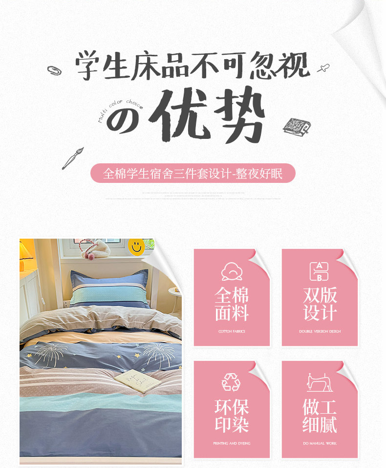 Хлопковый комплект для школьников и студентов, хлопковая простыня, пододеяльник, подходит для студента, 3 предмета, постельные принадлежности