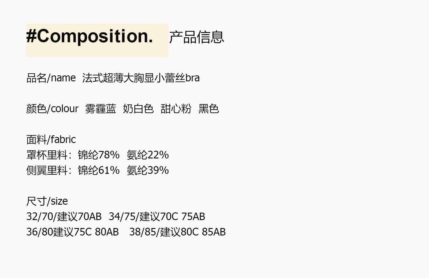 | Размер: | 32/70 (предложение 70ab), 34/75 (предложение 70c/75ab), 36/80 (рекомендуется 75C/80AB), 38/85 (рекомендуется 80C/85AB) |