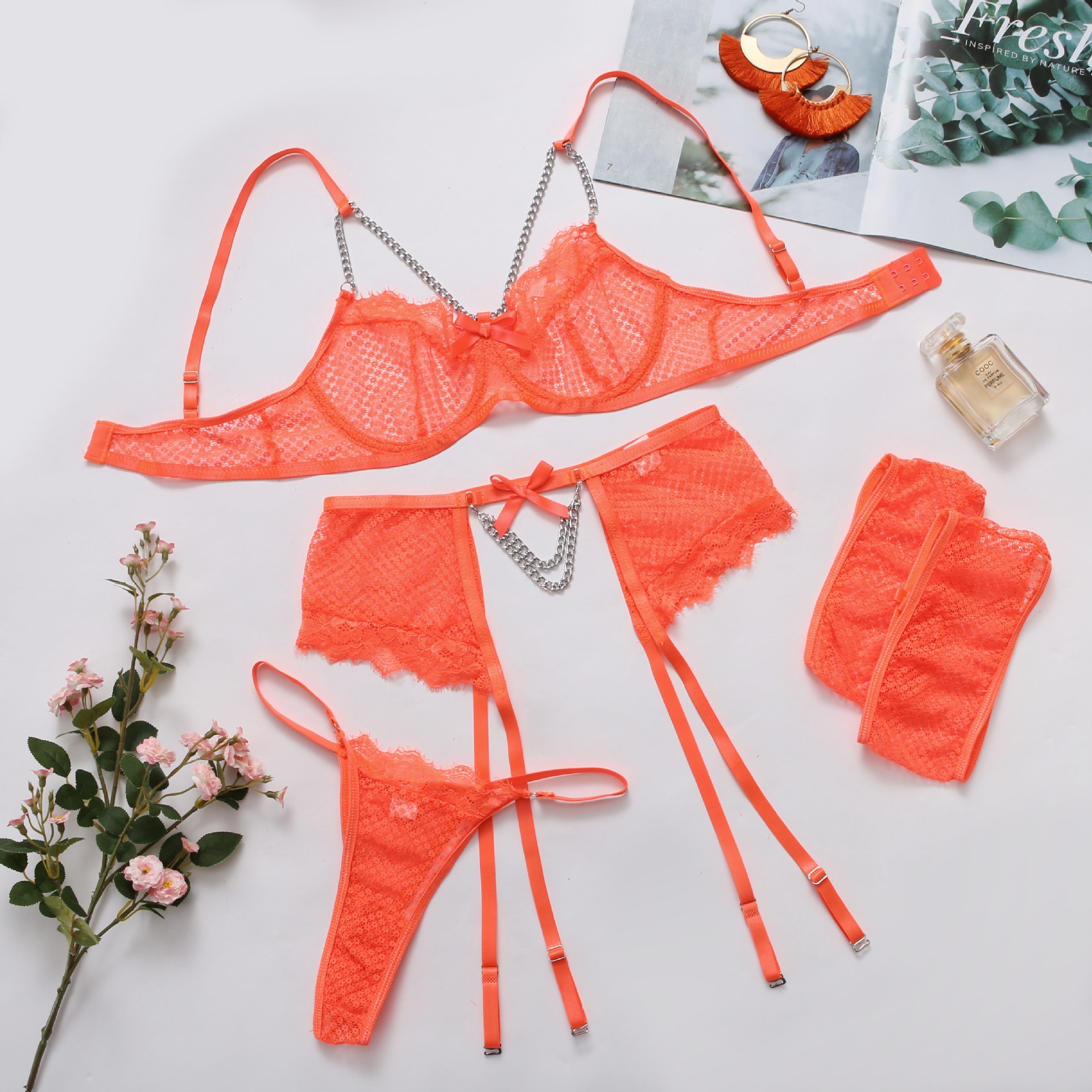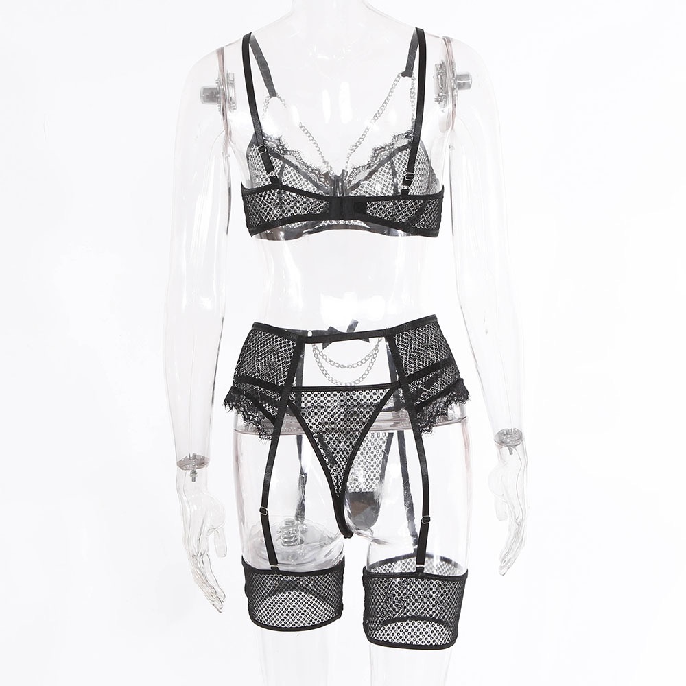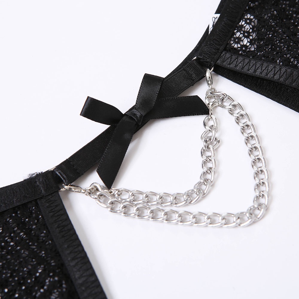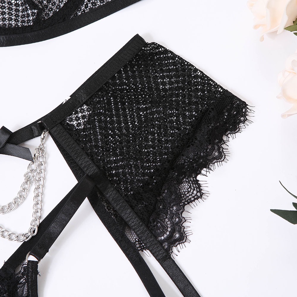 Кружевной дизайнерский бюстгалтер со стальными косточками, металлический комплект, дизайнерская цепь, 4 предмета