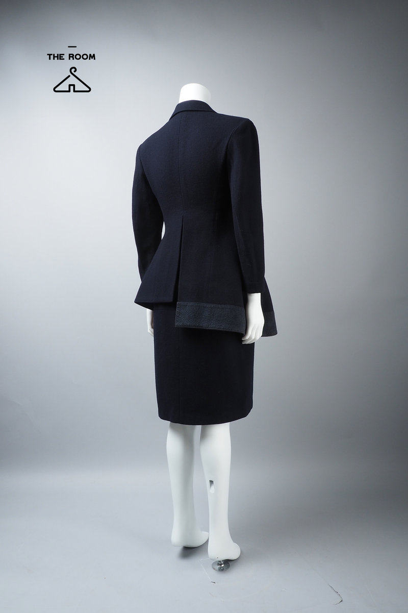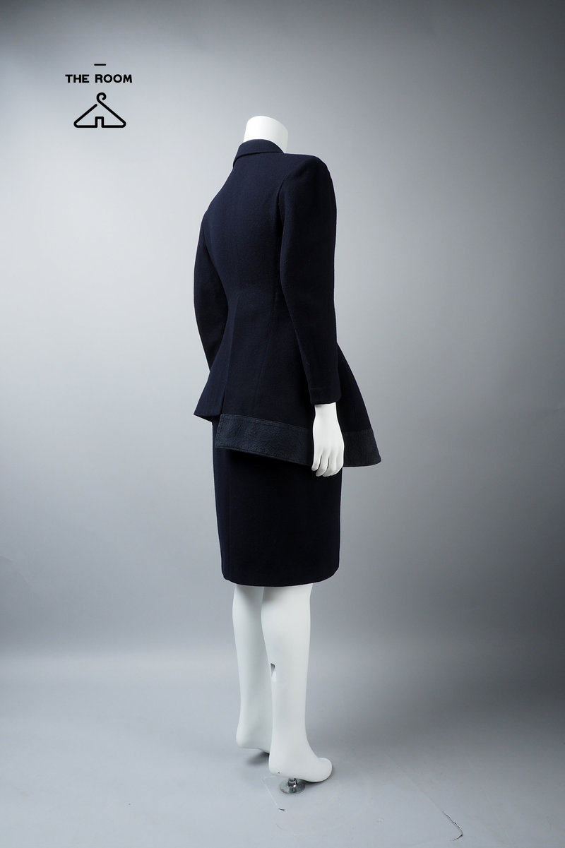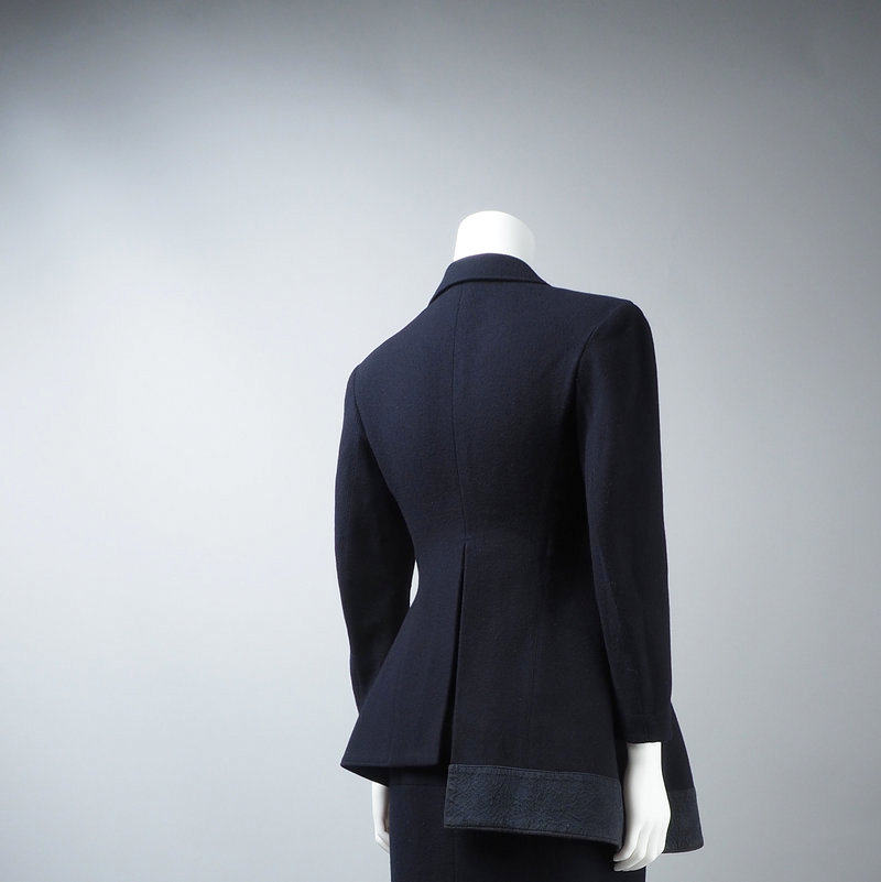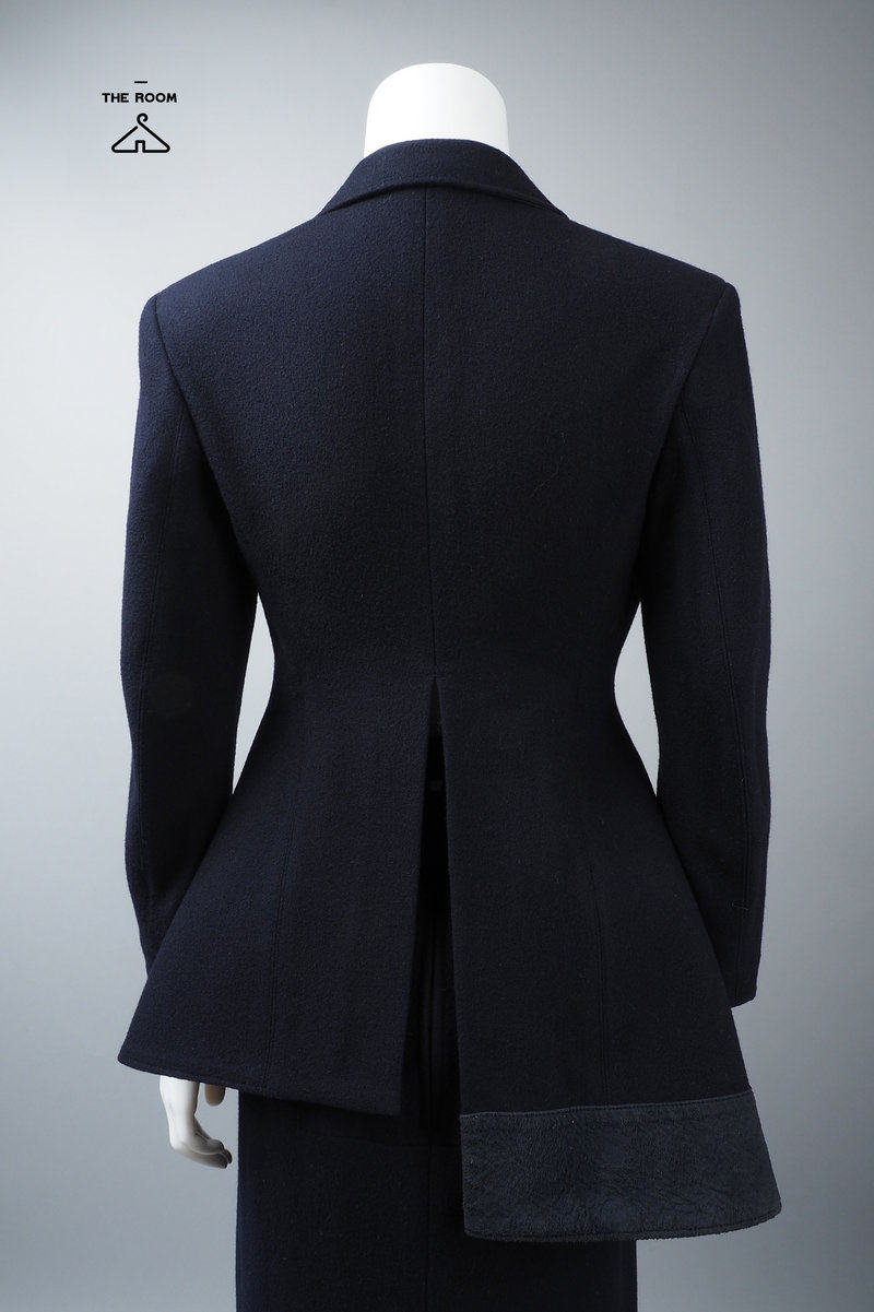 Фасон костюма, минималистичный крой, с подплечниками, зауженной талией, только одним карманом и потайным боковым карманом на левой талии.