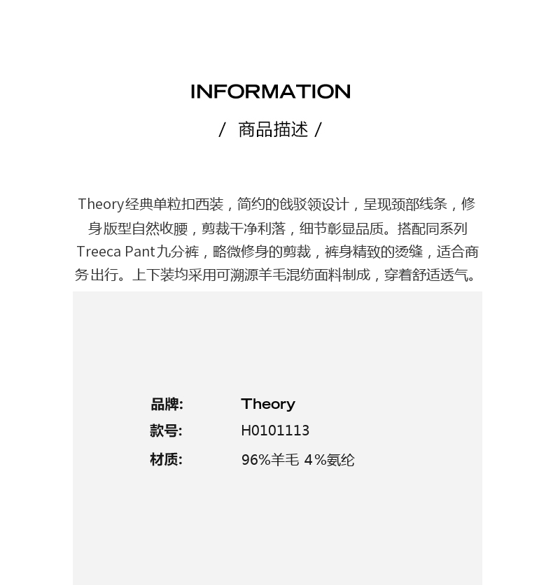 [Хорошая шерстяная ткань] Теория женская шерстяная шерсть Смешанная костюма и брюки H0101113 & H0101234
