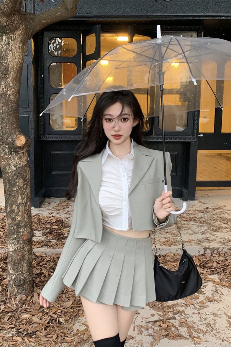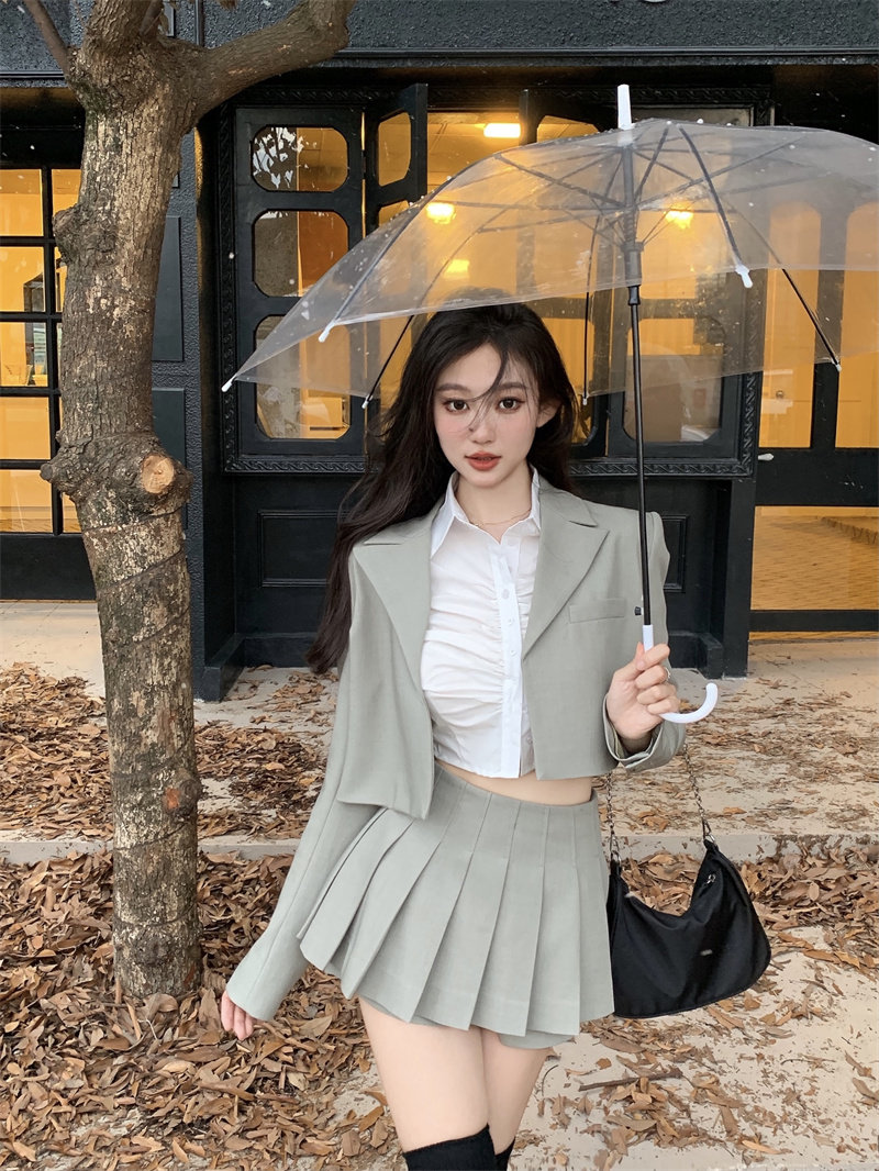 Зеленый короткий костюм, осенний пиджак классического кроя, небольшой кардиган, облегающий крой, коллекция 2022