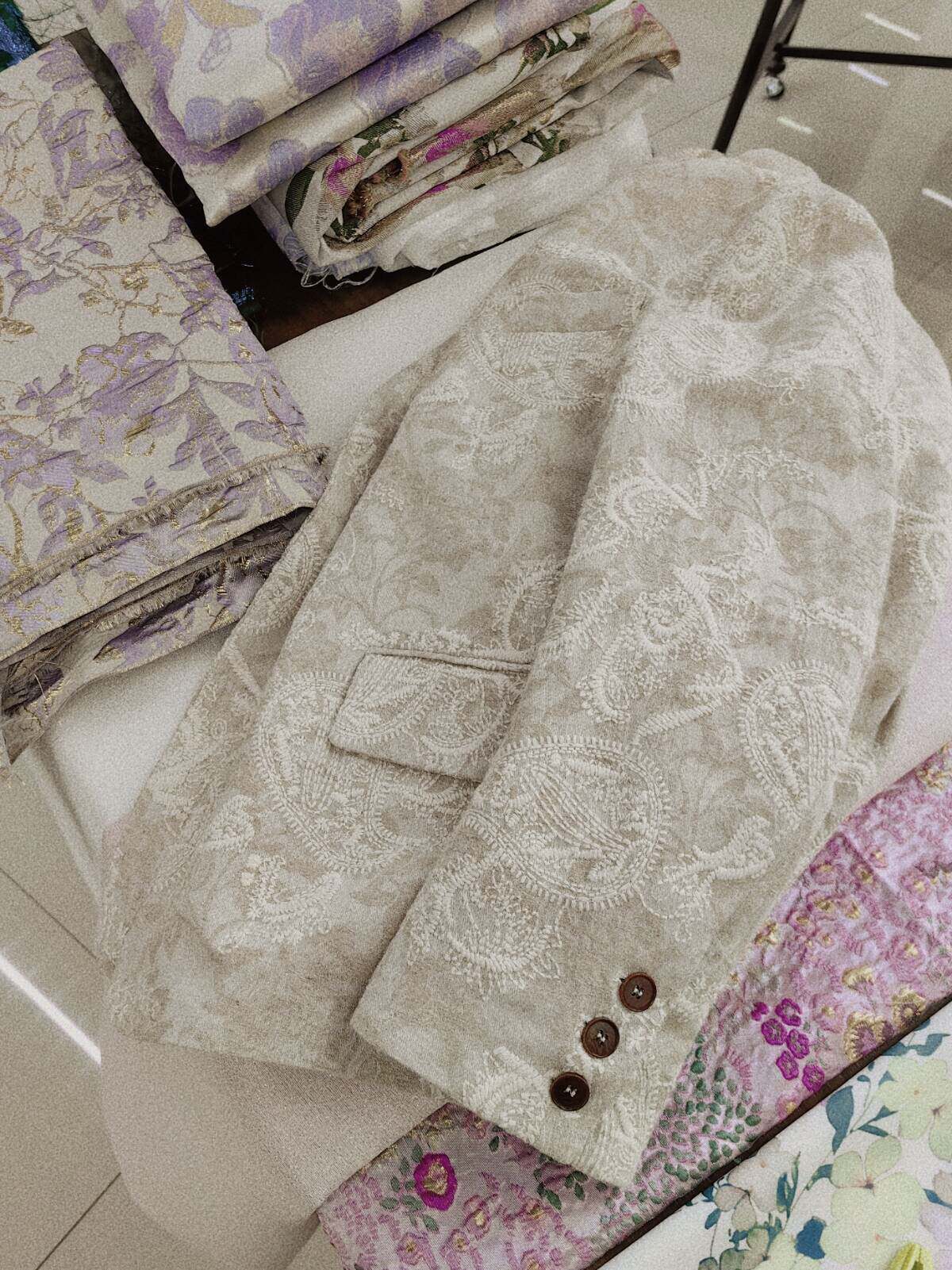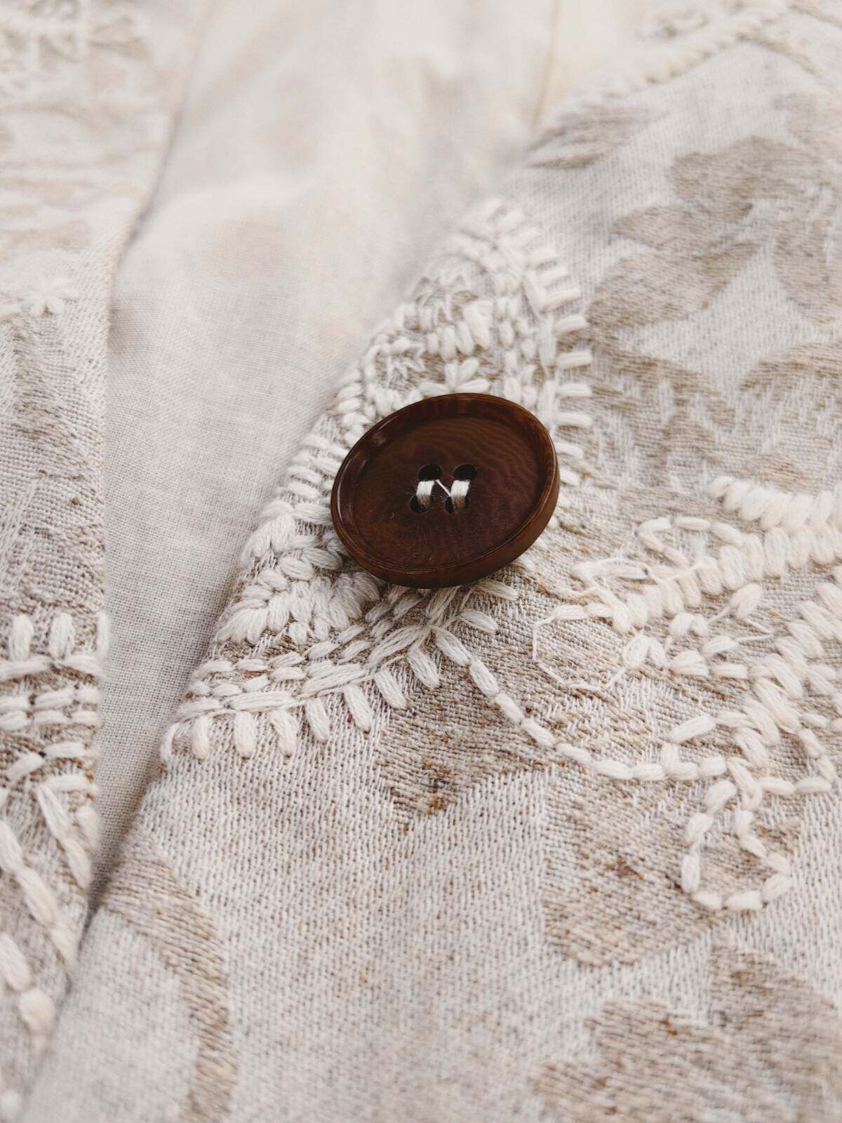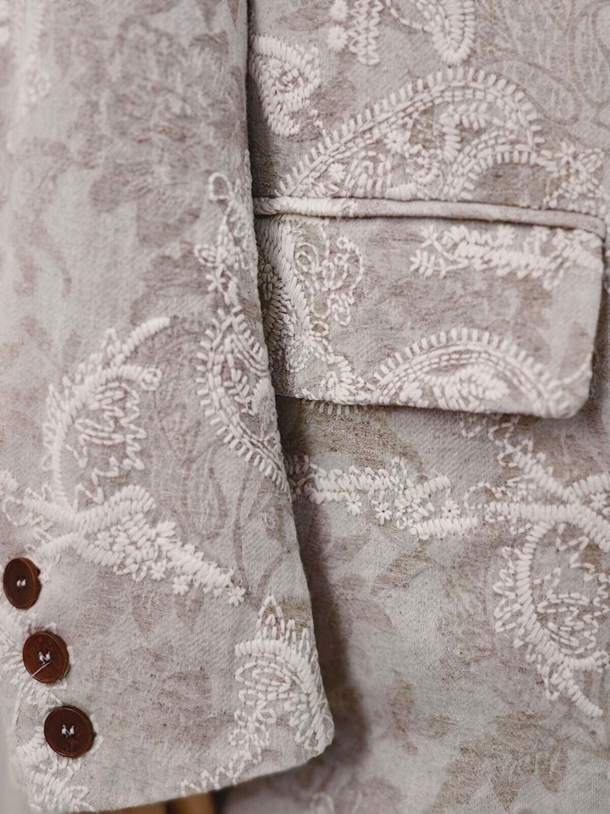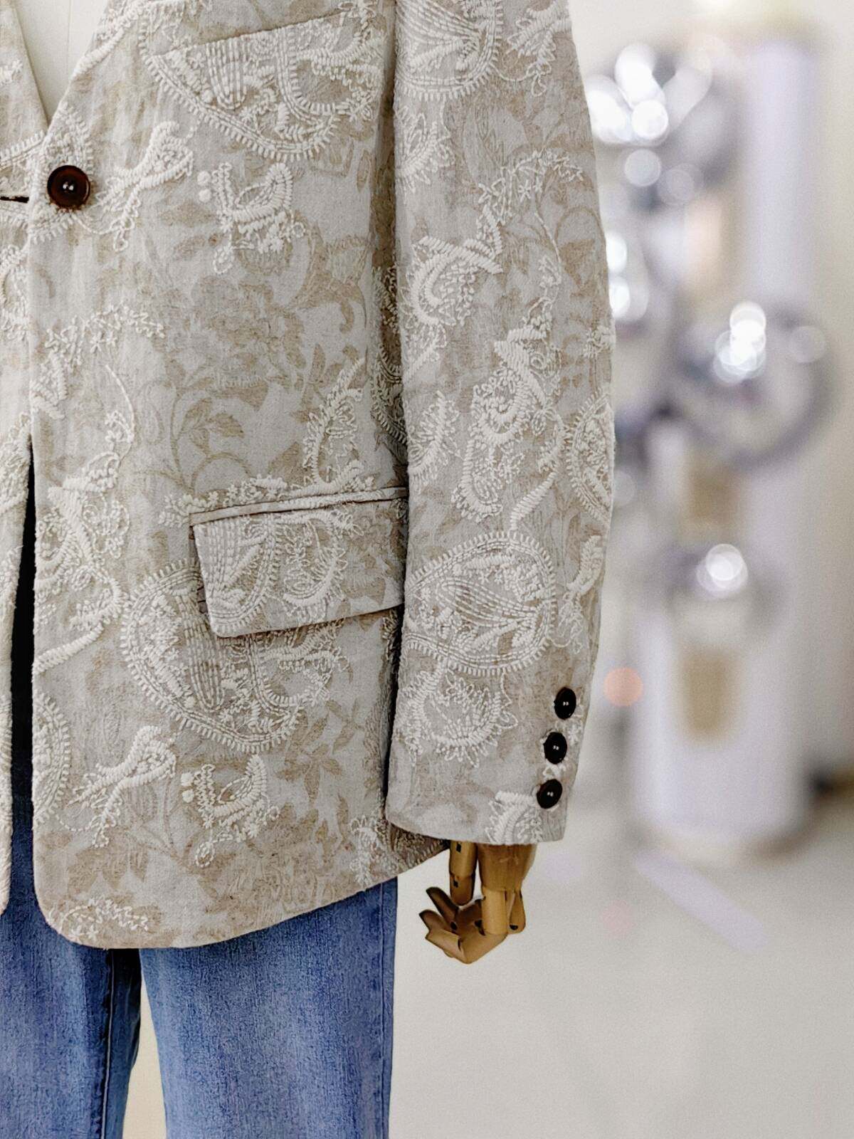 Костюм, бежевая куртка, оверсайз, с вышивкой, из хлопка и льна