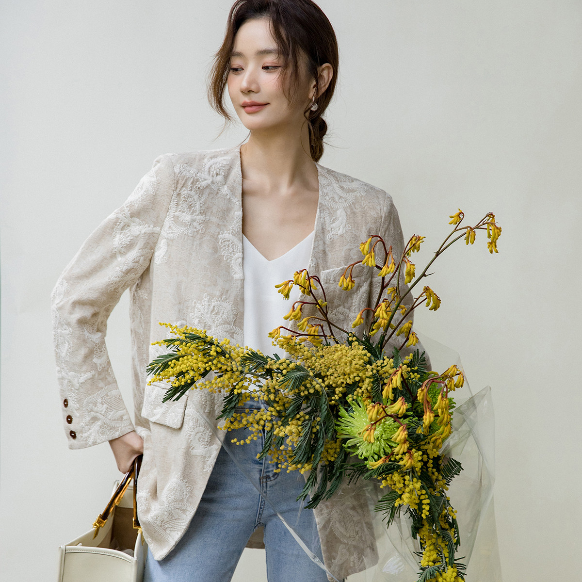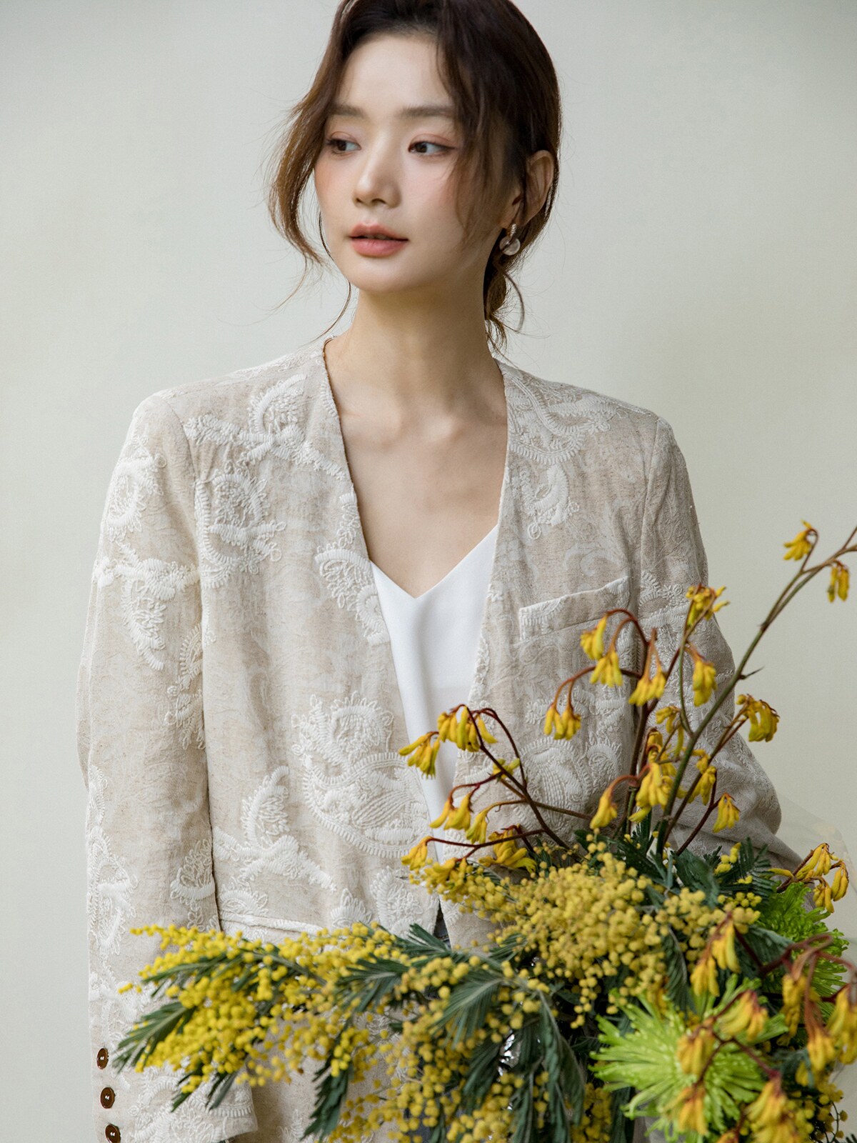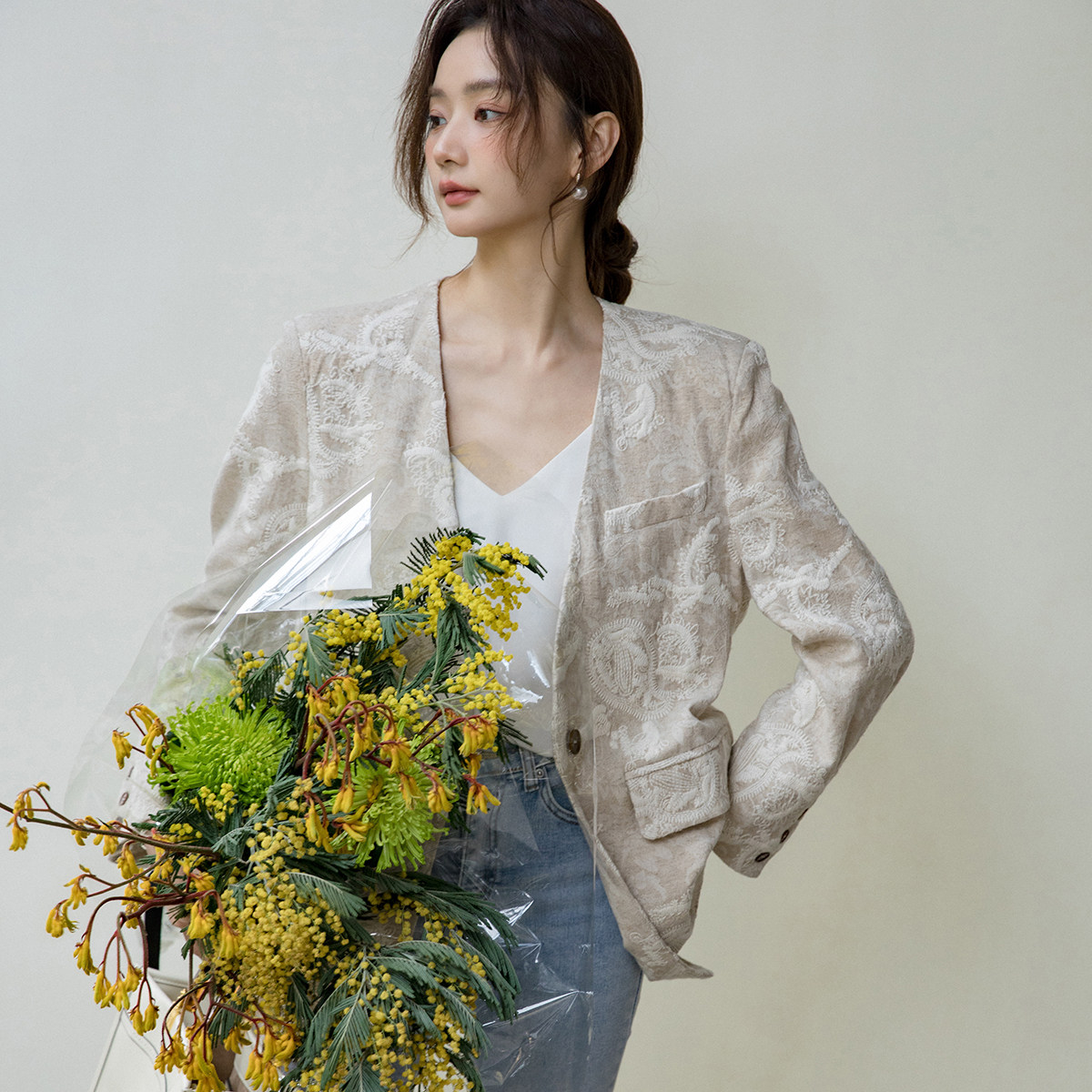 Костюм, бежевая куртка, оверсайз, с вышивкой, из хлопка и льна