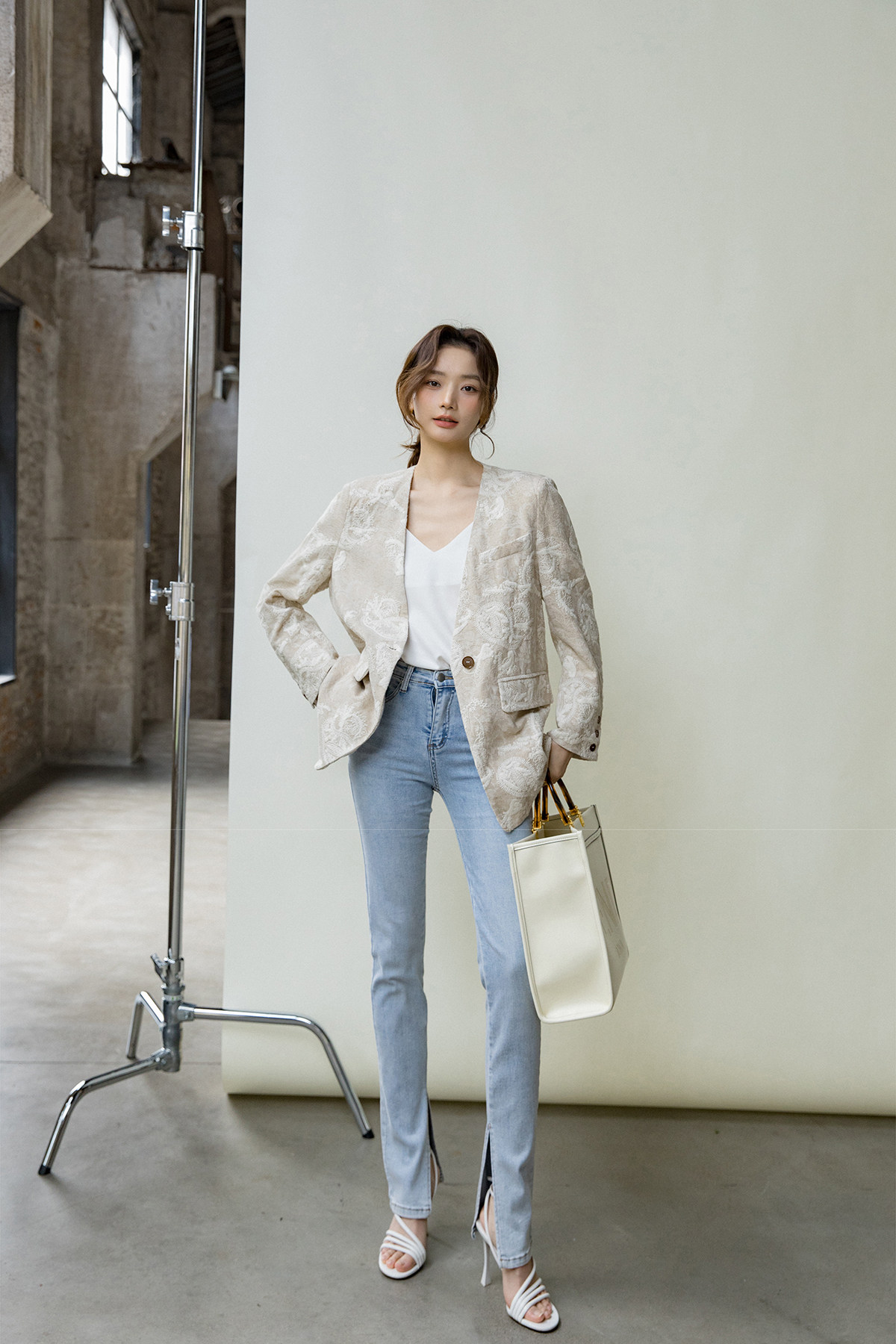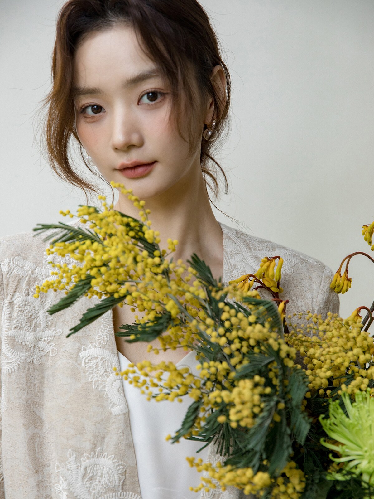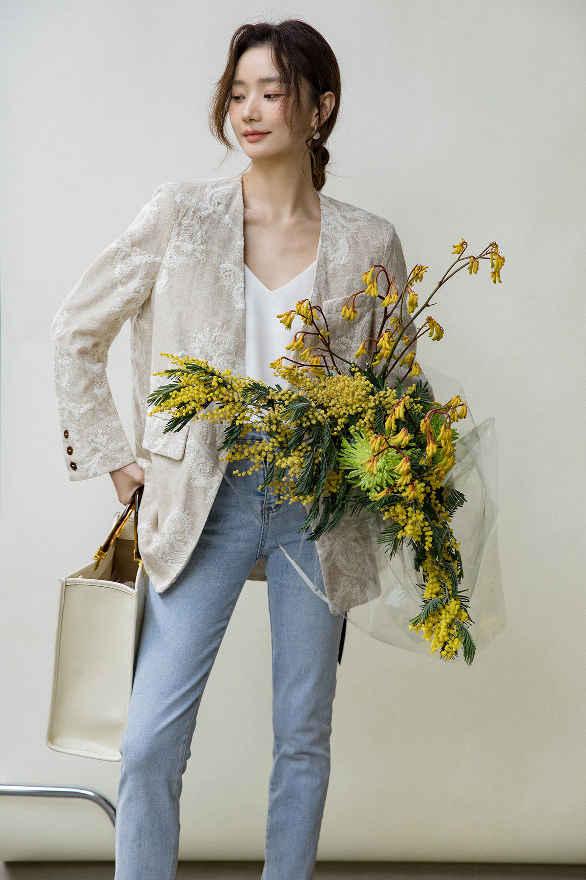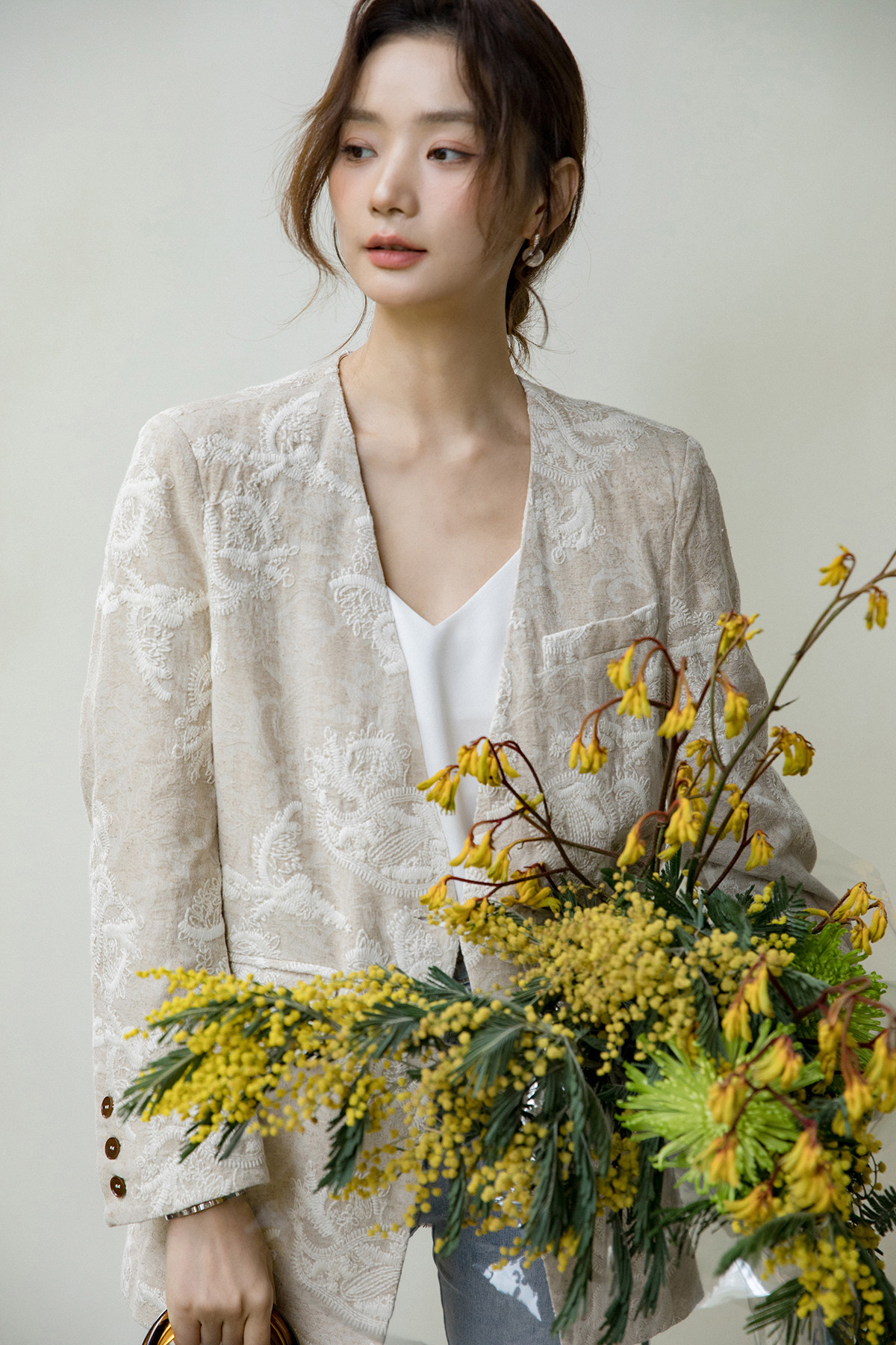 Костюм, бежевая куртка, оверсайз, с вышивкой, из хлопка и льна
