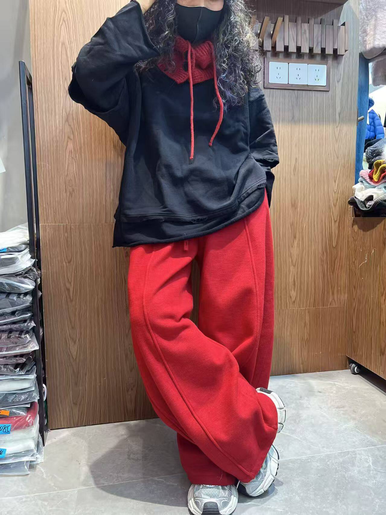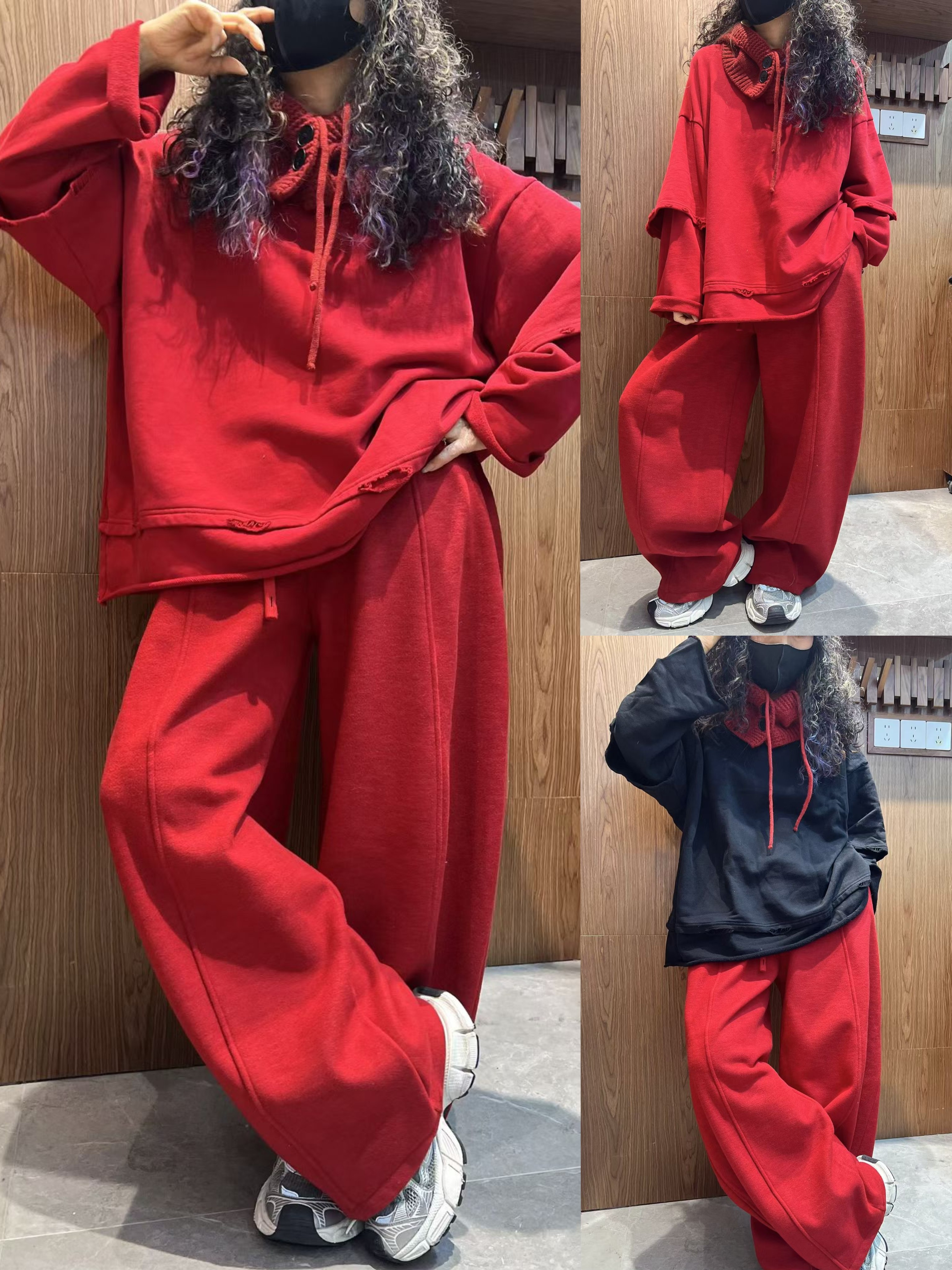 Толстовка с капюшоном, красный ретро утепленный комплект для отдыха, оверсайз