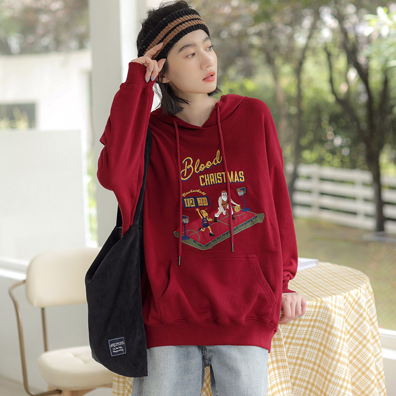 Бордовая осенняя толстовка с капюшоном, дизайнерский бархатный лонгслив, с вышивкой, тренд сезона