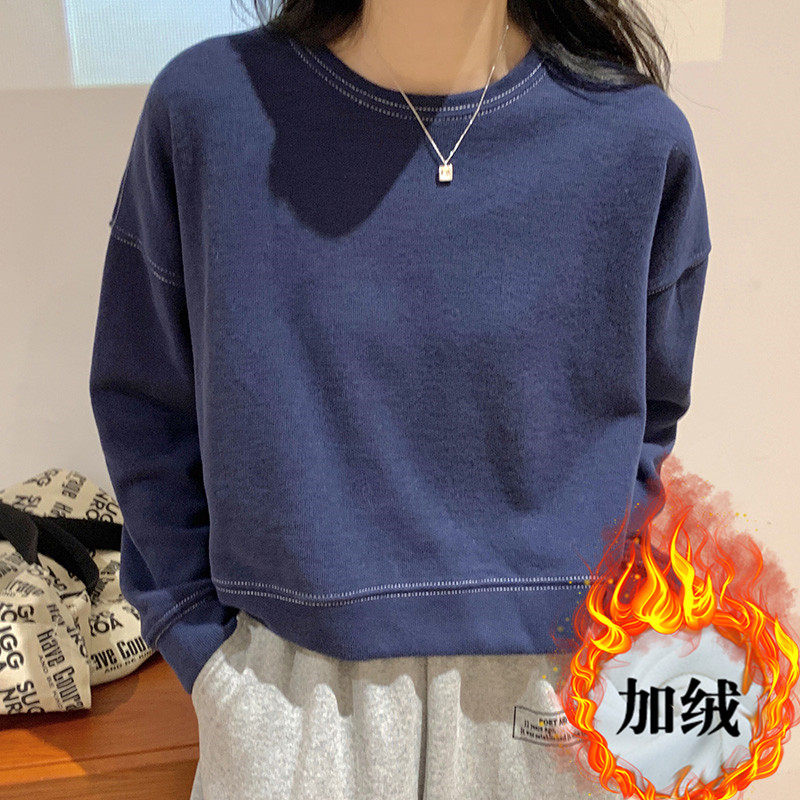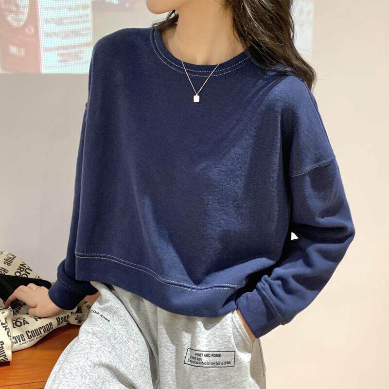 Синий короткий флисовый осенний демисезонный лонгслив с круглым воротником, в корейском стиле, подходит для подростков
