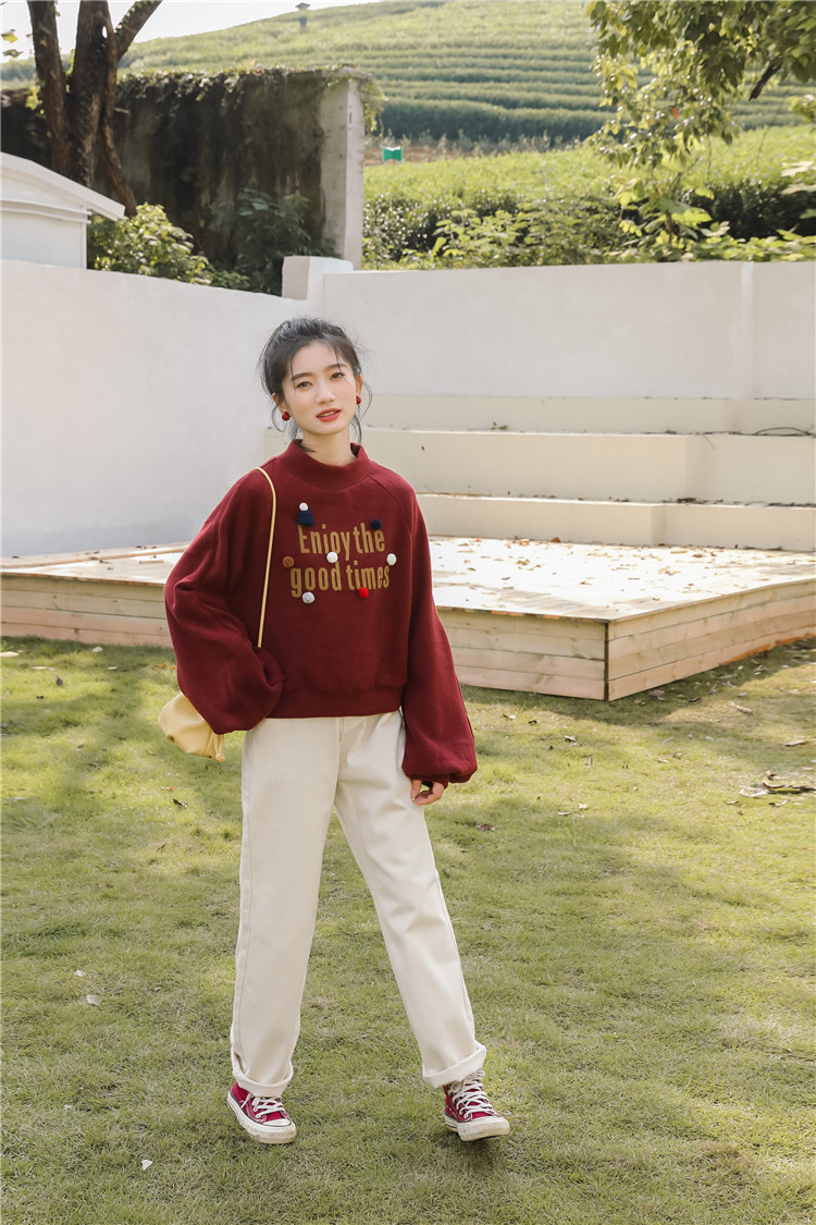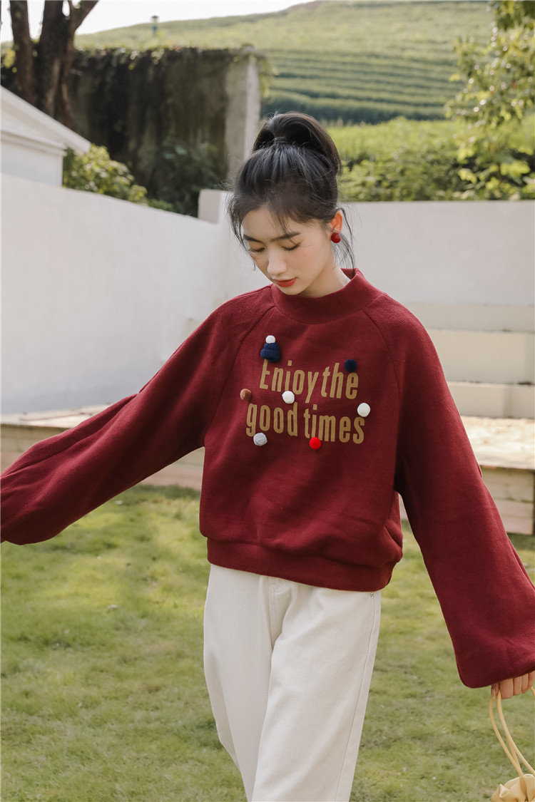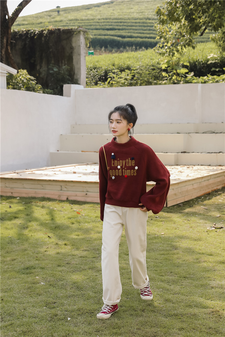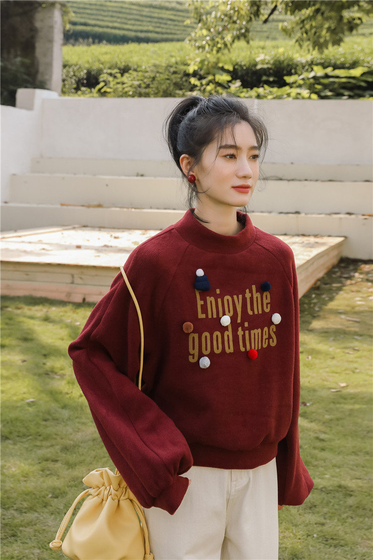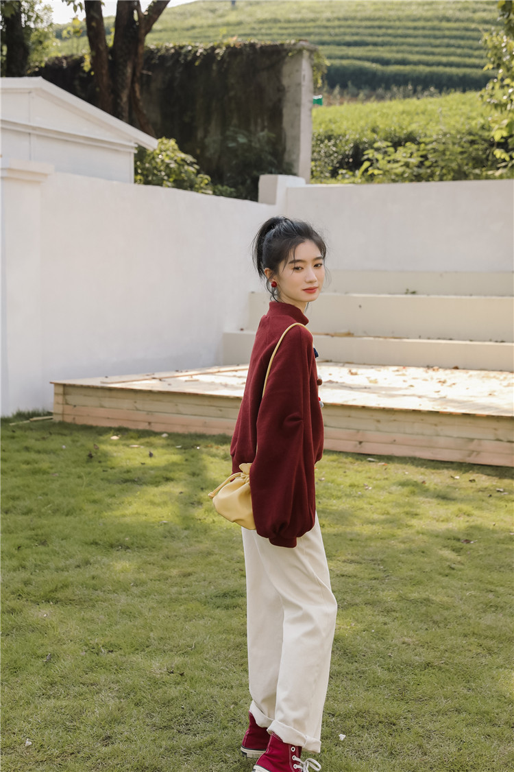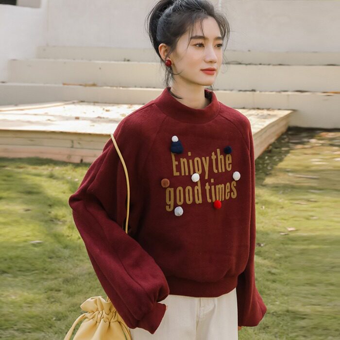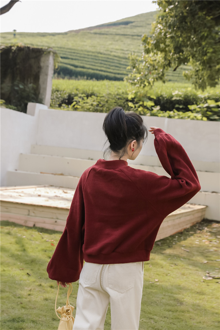 Демисезонная утепленная толстовка, бордовая футболка, куртка, бархатный лонгслив, высокий воротник, рукава фонарики