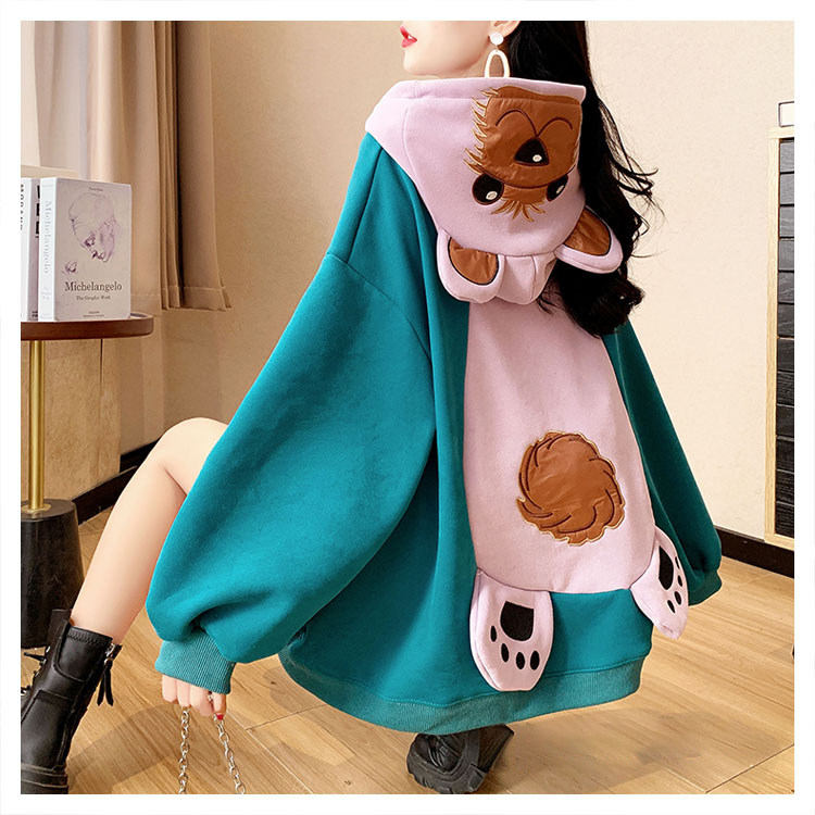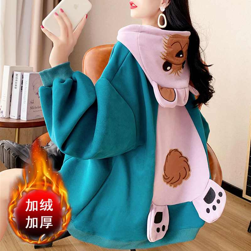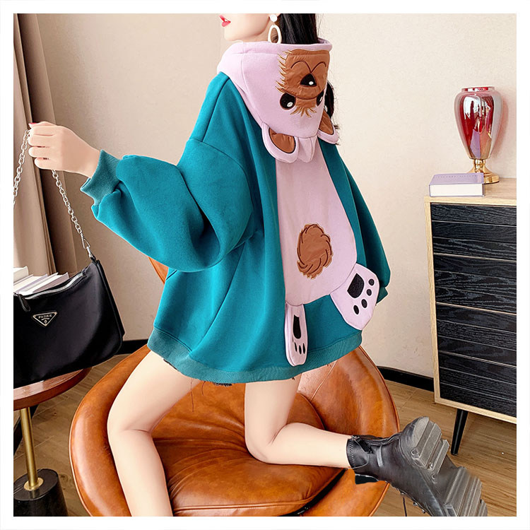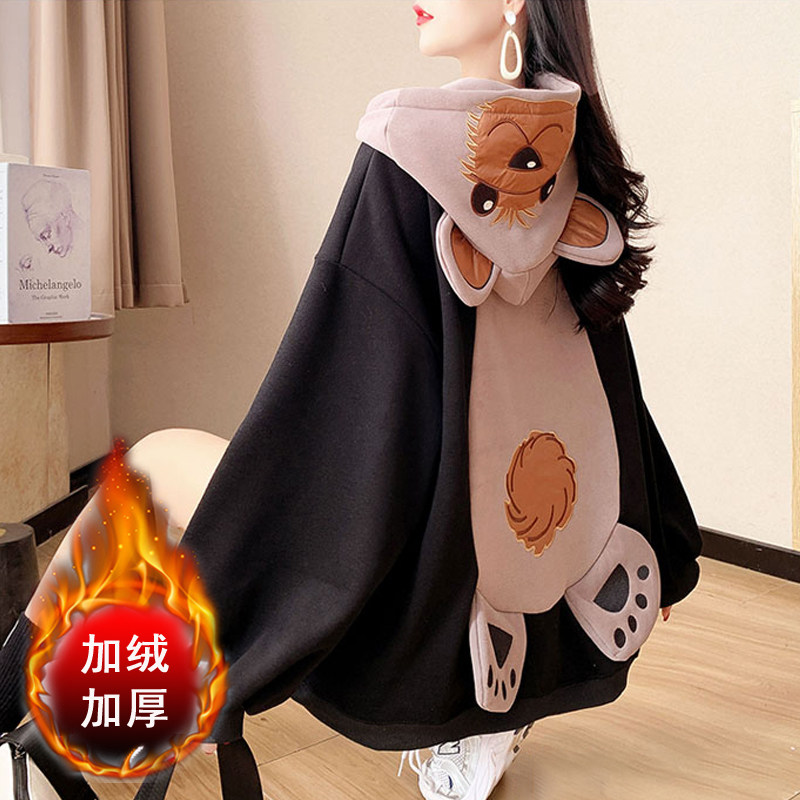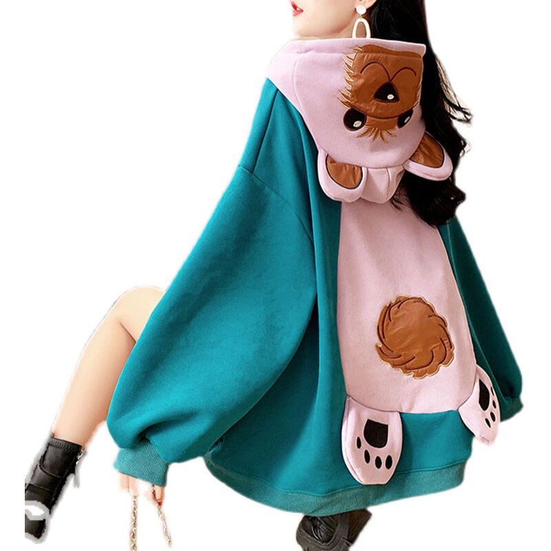 Демисезонная толстовка с капюшоном, утепленные очень большие джинсы с начесом, куртка, с медвежатами, в корейском стиле, большой размер