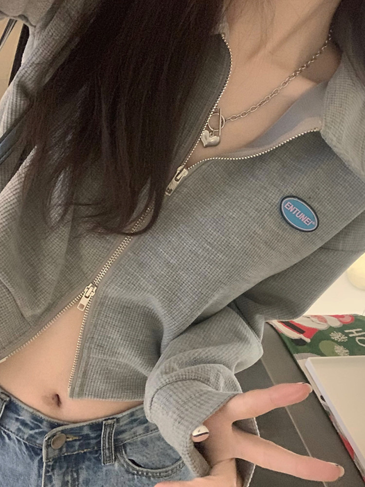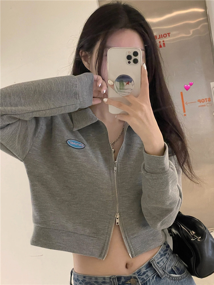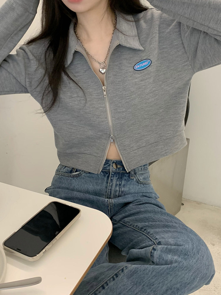 Короткий весенний дизайнерский лонгслив с молнией, воротник поло, тренд сезона