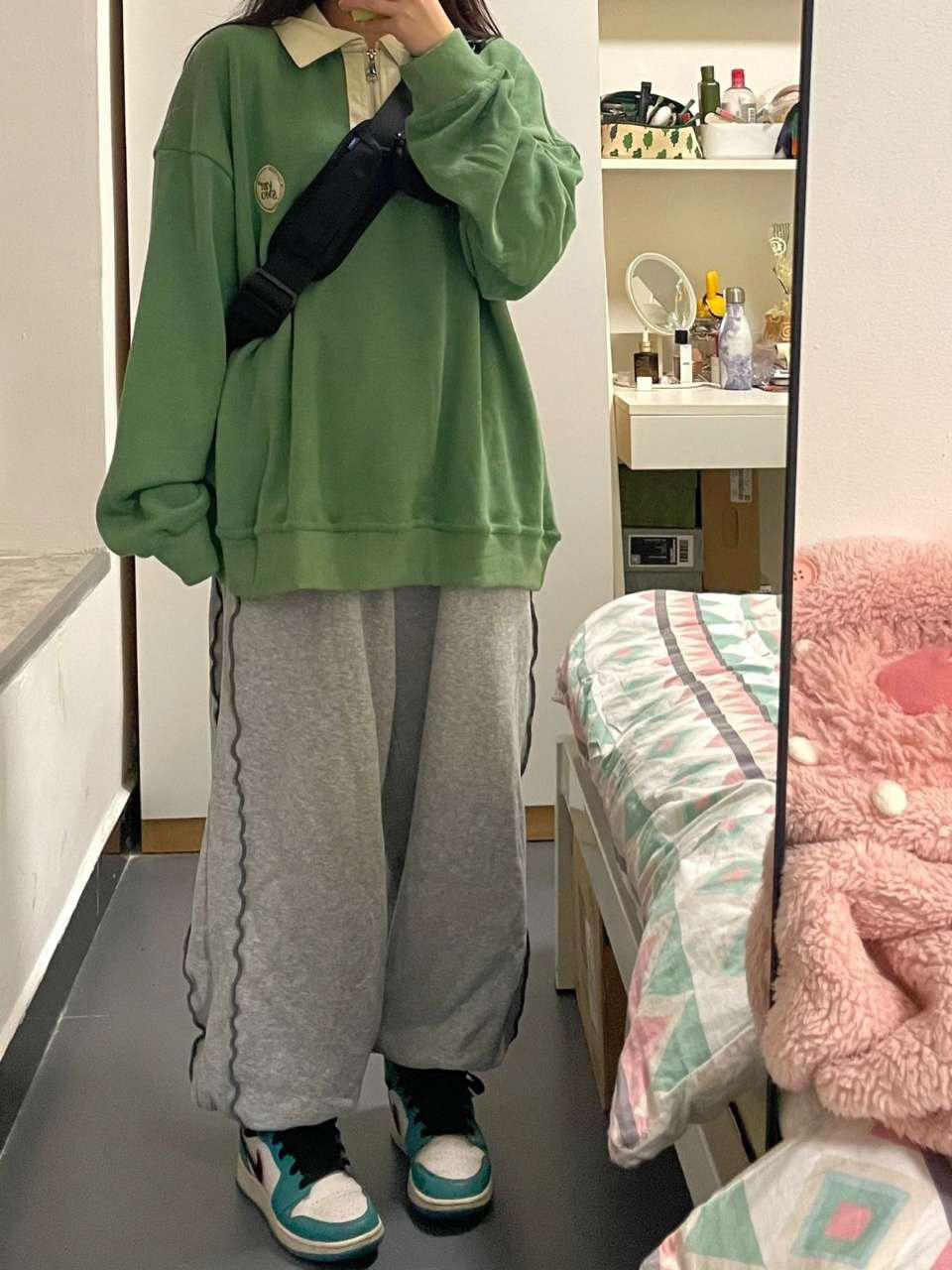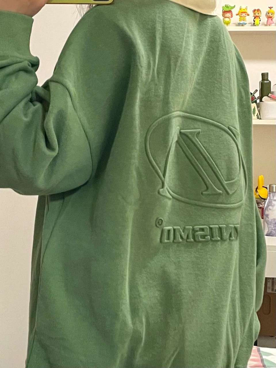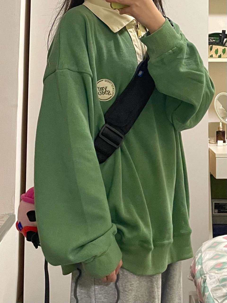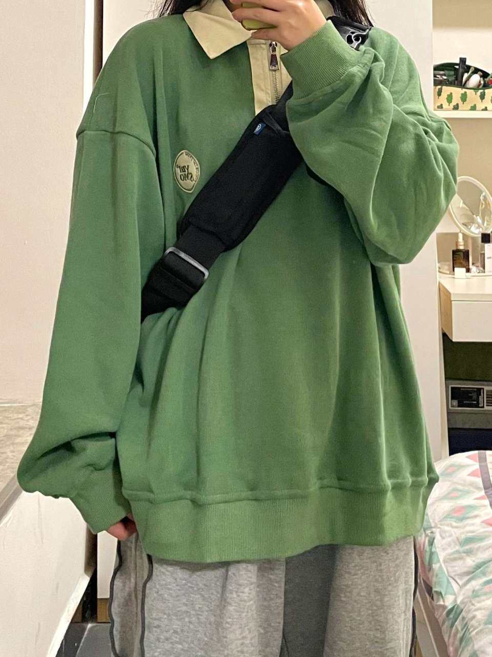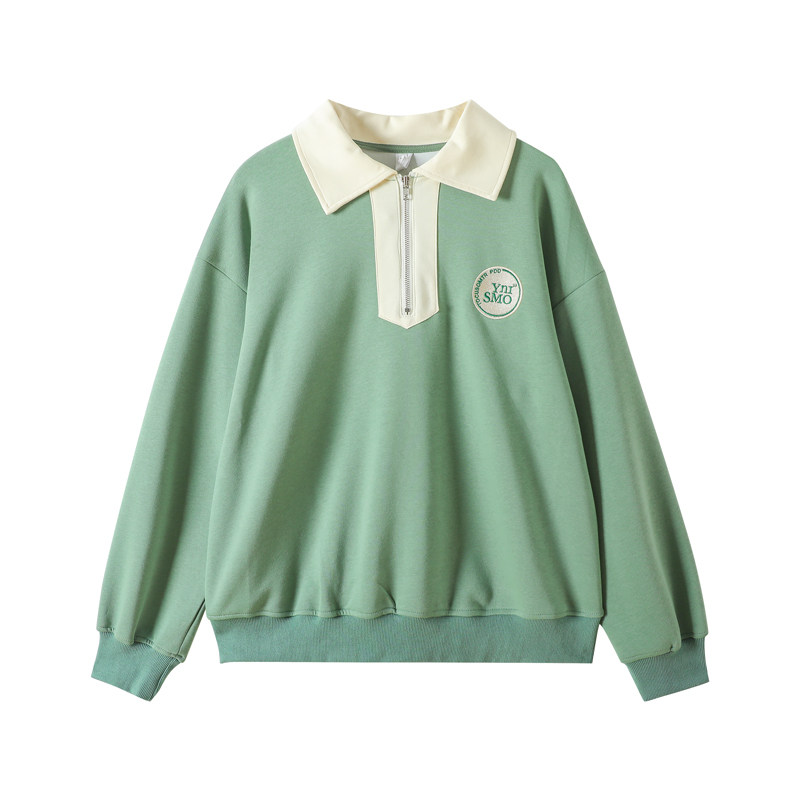 Зеленый осенний ретро свитшот, лонгслив, воротник поло, в американском стиле, оверсайз, свободный крой